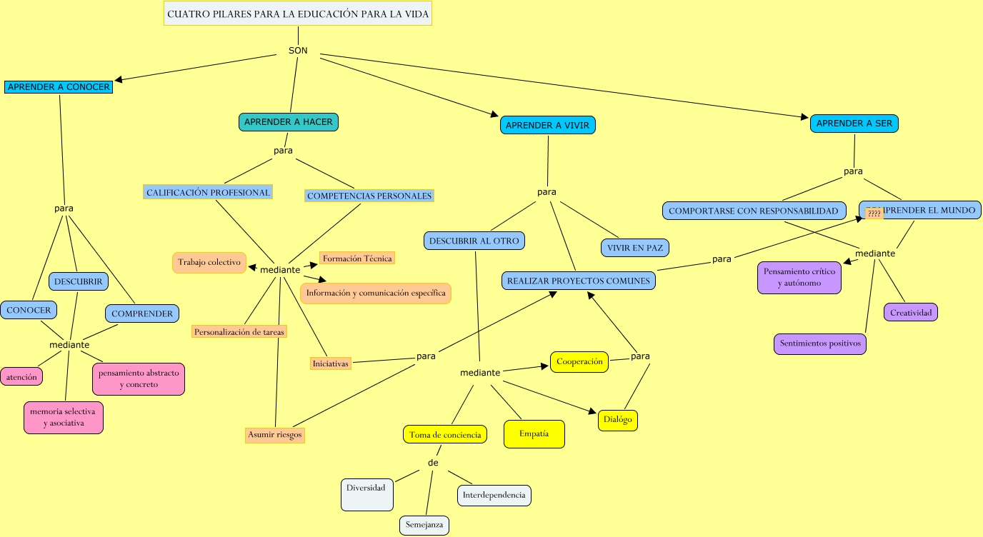 Este Cmap, tiene información relacionada con: CUATRO PILARES PARA LA EDUCACIÓN PARA LA VIDA, Cooperación para REALIZAR PROYECTOS COMUNES, APRENDER A VIVIR para REALIZAR PROYECTOS COMUNES, DESCUBRIR AL OTRO mediante Dialógo, COMPRENDER mediante memoria selectiva y asociativa, DESCUBRIR AL OTRO mediante Empatía, Iniciativas para REALIZAR PROYECTOS COMUNES, COMPETENCIAS PERSONALES mediante Iniciativas, CONOCER mediante pensamiento abstracto y concreto, CALIFICACIÓN PROFESIONAL mediante Iniciativas, APRENDER A HACER para CALIFICACIÓN PROFESIONAL, Toma de conciencia de Diversidad, COMPRENDER EL MUNDO mediante Sentimientos positivos, COMPRENDER EL MUNDO mediante Pensamiento crítico y autónomo, APRENDER A CONOCER para COMPRENDER, CONOCER mediante atención, CALIFICACIÓN PROFESIONAL mediante Información y comunicación específica, APRENDER A SER para COMPRENDER EL MUNDO, COMPETENCIAS PERSONALES mediante Personalización de tareas, COMPRENDER EL MUNDO mediante Creatividad, APRENDER A HACER para COMPETENCIAS PERSONALES