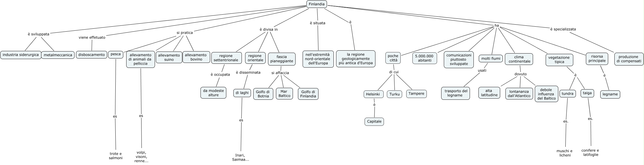 Questa Cmap, creata con IHMC CmapTools, contiene informazioni relative a: Finlandia03, Finlandia ha risorsa principale, Finlandia ha 5.000.000 abitanti, clima continentale dovuto lontananza dall'Atlantico, Finlandia è la regione geologicamente più antica d'Europa, Finlandia si pratica allevamento suino, Finlandia ha clima continentale, Finlandia ha molti fiumi, vegetazione tipica è taiga, pesca es trote e salmoni, fascia pianeggiante si affaccia Mar Baltico, Finlandia ha comunicazioni piuttosto sviluppate, Finlandia è specializzata produzione di compensati, clima continentale dovuto debole influenza del Baltico, poche città di cui Turku, tundra es. muschi e licheni, Finlandia ha poche città, Finlandia si pratica allevamento di animali da pelliccia, poche città di cui Tampere, allevamento di animali da pelliccia es volpi, visoni, renne..., Finlandia è divisa in fascia pianeggiante