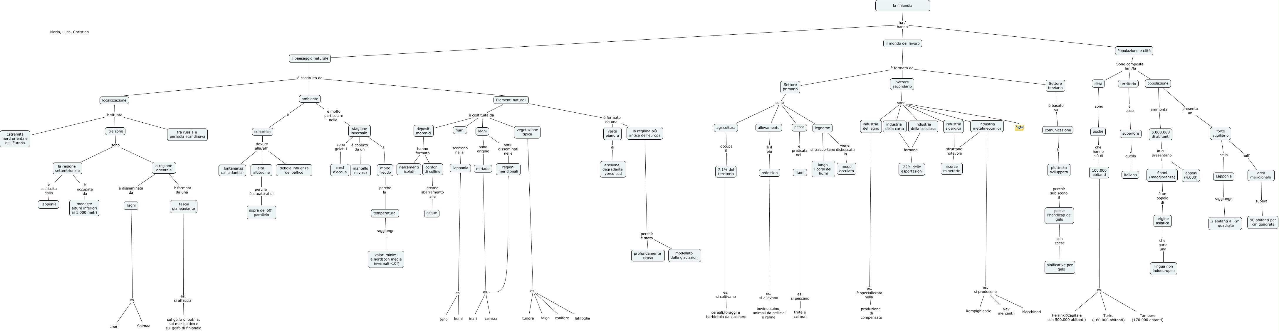 Questa Cmap, creata con IHMC CmapTools, contiene informazioni relative a: finlandia14, fascia pianeggiante es. si affaccia sul golfo di botnia, sul mar baltico e sul golfo di finlandia, la regione orientale è disseminata da laghi, legname viene disboscato in modo occulato, industria della cellulosa fornono 22% delle esportazioni, laghi es. Inari, 7,1% del territorio es, si coltivano cereali,foraggi e barbietola da zucchero, vegetazione tipica es. latifoglie, industria metalmeccanica es, si producono Navi mercantili, Popolazione e città Sono composte le/il/la popolazione, alta altitudine perchè è situato al di sopra del 60° parallelo, forte squilibrio nella Lapponia, temperatura raggiunge i valori minimi a nord(con medie invernali -10°), cordoni di colline creano sbarramento alle acque, depositi morenici hanno formato cordoni di colline, il paesaggio naturale è costituito da Elementi naturali, 100.000 abitanti es. Tampere (170.000 abtanti), Settore secondario sono industria del legno, Settore primario sono legname, la regione più antica dell'europa perchè è stato modellato dalle glaciazioni, lapponia es. kemi