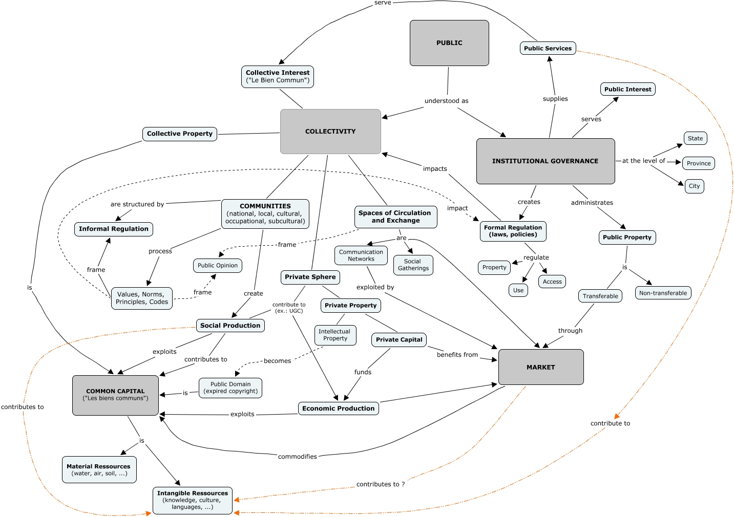 Cette carte de concepts créée avec IHMC CmapTools traite de: WrapUp-mapping-commons-19April2012, MARKET contributes to ? Intangible Ressources (knowledge, culture, languages, ...), Spaces of Circulation and Exchange are Social Gatherings, Private Capital funds Economic Production, INSTITUTIONAL GOVERNANCE at the level of Province, COMMON CAPITAL ("Les biens communs") is Material Ressources (water, air, soil, ...), Public Property is Non-transferable, Social Production contributes to Intangible Ressources (knowledge, culture, languages, ...), INSTITUTIONAL GOVERNANCE administrates Public Property, Social Production exploits COMMON CAPITAL ("Les biens communs"), PUBLIC understood as COLLECTIVITY, Transferable through MARKET, Formal Regulation (laws, policies) regulate Access, Formal Regulation (laws, policies) regulate Use, INSTITUTIONAL GOVERNANCE at the level of State, Values, Norms, Principles, Codes impact Formal Regulation (laws, policies), Private Property Private Capital, COLLECTIVITY Collective Interest ("Le Bien Commun"), Private Sphere Private Property, Spaces of Circulation and Exchange are MARKET, COLLECTIVITY Collective Property
