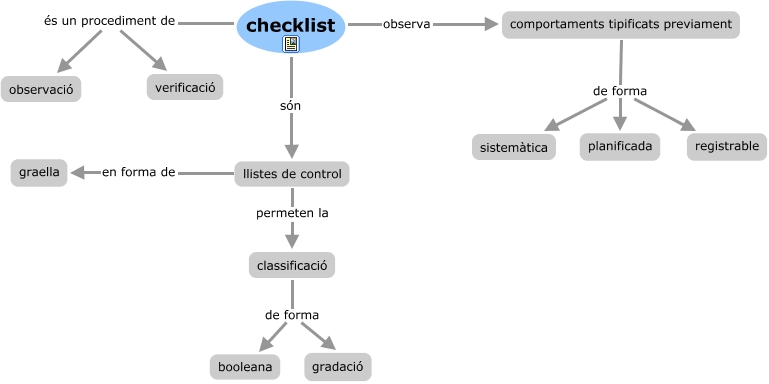 Este Cmap, tiene información relacionada con: checklist, classificació de forma gradació, checklist observa comportaments tipificats previament, checklist són llistes de control, comportaments tipificats previament de forma planificada, checklist és un procediment de observació, llistes de control en forma de graella, comportaments tipificats previament de forma sistemàtica, comportaments tipificats previament de forma registrable, llistes de control permeten la classificació, classificació de forma booleana, checklist és un procediment de verificació