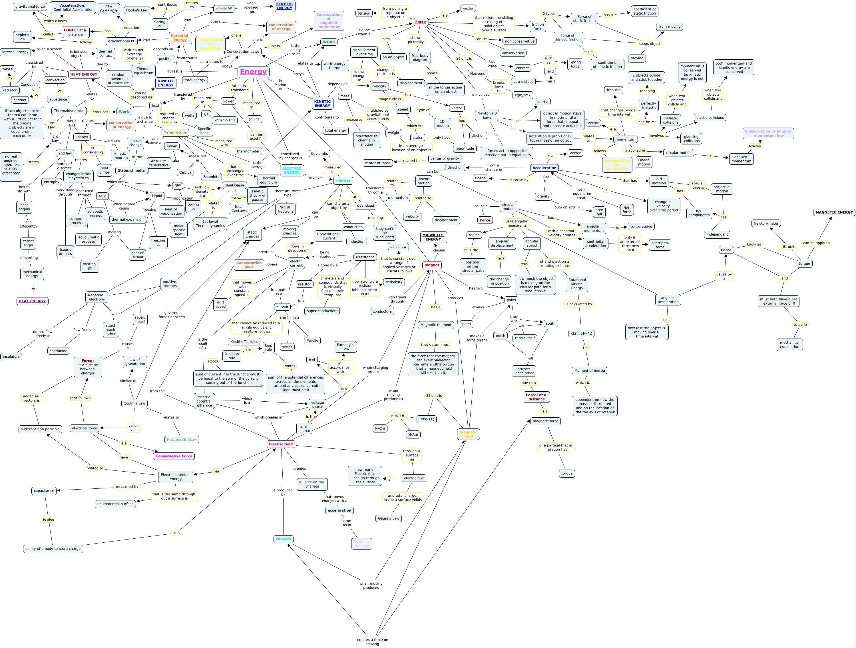 This Concept Map, created with IHMC CmapTools, has information related to: Energy_TERESA WILSON_final copy, Electric field creates a Force on the charges, electric potential differnce which creates an Electric field, charges can be static charges, solid melting melting pt, capacitance is also ability of a body to store charge, charges can be moving charges, solid When heated cause thermal expansion, ability of a body to store charge in a Electric field, 2-d mothion has x,y components, south will repal: itself, Coulm's Law similar to law of gravatation, changes inside a system to heat used through adiabatic process, Acceleration due to gravity, electric current flows in direction of Conventional current, Conservation Laws one is conservation of energy, Acceleration from a change in direction, south will attract: each other, circular motion has angular momentum, charges can charge a object by induction, changes inside a system to heat used through isovolumetic process