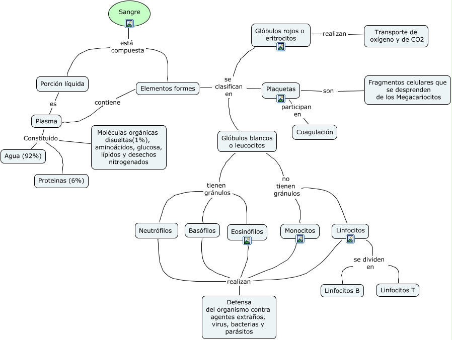 Este Cmap, tiene información relacionada con: La sangre y el sistema nuclear fagocítico, Glóbulos blancos o leucocitos no tienen gránulos Monocitos, Elementos formes se clasifican en Glóbulos blancos o leucocitos, Neutrófilos realizan Linfocitos, Neutrófilos realizan Eosinófilos, Neutrófilos realizan Defensa del organismo contra agentes extraños, virus, bacterias y parásitos, Linfocitos se dividen en Linfocitos B, Plasma Constituido Moléculas orgánicas disueltas(1%), aminoácidos, glucosa, lípidos y desechos nitrogenados, Glóbulos rojos o eritrocitos realizan Transporte de oxígeno y de CO2, Elementos formes se clasifican en Plaquetas, Plaquetas son Fragmentos celulares que se desprenden de los Megacariocitos, Neutrófilos realizan Basófilos, Elementos formes se clasifican en Glóbulos rojos o eritrocitos, Glóbulos blancos o leucocitos tienen gránulos Neutrófilos, Plaquetas participan en Coagulación, Porción líquida es Plasma, Plasma Constituido Proteinas (6%), Sangre está compuesta Elementos formes, Sangre está compuesta Porción líquida, Linfocitos se dividen en Linfocitos T, Neutrófilos realizan Monocitos