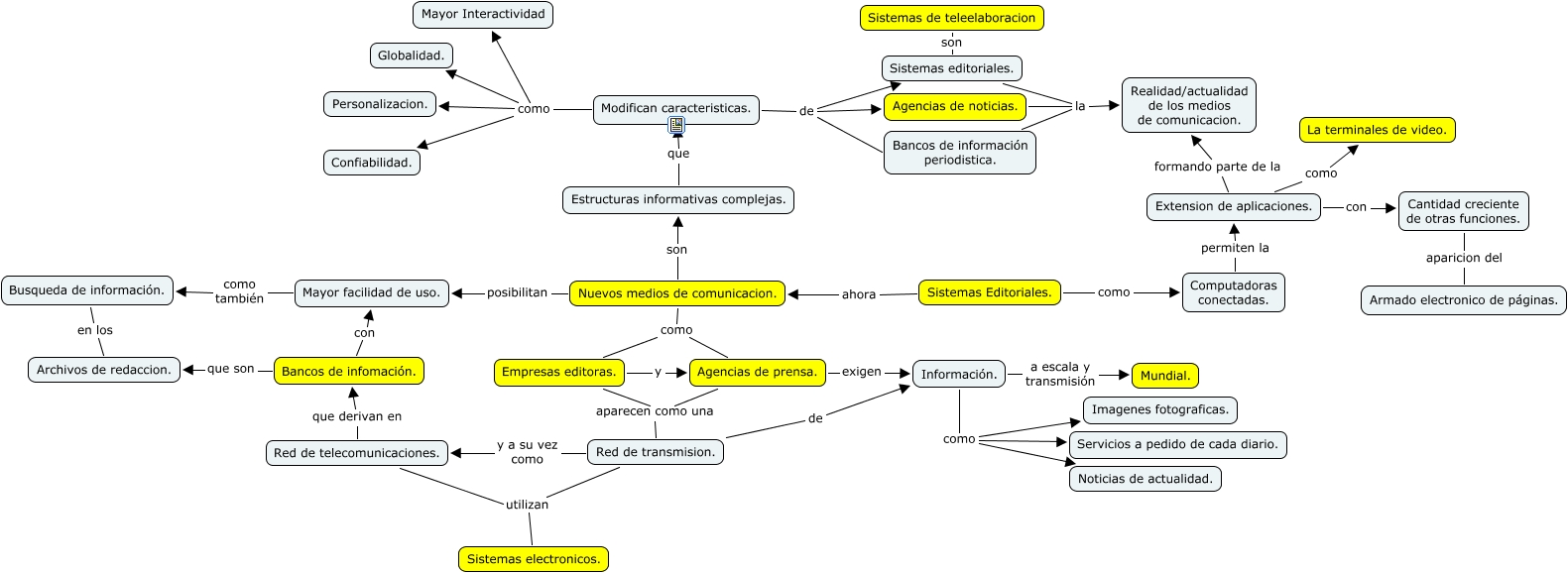 Este Cmap, tiene información relacionada con: Usos Mi parte, Nuevos medios de comunicacion. como Empresas editoras., Bancos de infomación. que son Archivos de redaccion., Red de telecomunicaciones. utilizan Sistemas electronicos., Empresas editoras. y Agencias de prensa., Empresas editoras. aparecen como una Red de transmision., Sistemas Editoriales. ahora Nuevos medios de comunicacion., Información. a escala y transmisión Mundial., Nuevos medios de comunicacion. como Agencias de prensa., Mayor facilidad de uso. como también Busqueda de información., Modifican caracteristicas. como Personalizacion., Modifican caracteristicas. como Globalidad., Extension de aplicaciones. con Cantidad creciente de otras funciones., Bancos de infomación. con Mayor facilidad de uso., Bancos de información periodistica. la Realidad/actualidad de los medios de comunicacion., Modifican caracteristicas. como Confiabilidad., Busqueda de información. en los Archivos de redaccion., Sistemas editoriales. son Sistemas de teleelaboracion, Red de transmision. utilizan Sistemas electronicos., Extension de aplicaciones. formando parte de la Realidad/actualidad de los medios de comunicacion., Modifican caracteristicas. como Mayor Interactividad
