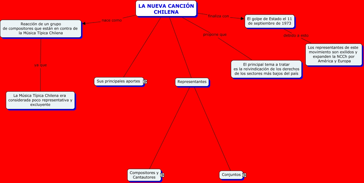 Este Cmap, tiene información relacionada con: Nueva Cancion Chilena, LA NUEVA CANCIÓN CHILENA ???? Sus principales aportes, El golpe de Estado el 11 de septiembre de 1973 debido a esto Los representantes de este movimiento son exilidos y expanden la NCCh por América y Europa, LA NUEVA CANCIÓN CHILENA finaliza con El golpe de Estado el 11 de septiembre de 1973, Representantes ???? Conjuntos, Representantes ???? Compositores y Cantautores, LA NUEVA CANCIÓN CHILENA ???? Representantes, Reacción de un grupo de compositores que están en contra de la Música Típica Chilena ya que La Música Típica Chilena era considerada poco representativa y excluyente, LA NUEVA CANCIÓN CHILENA nace como Reacción de un grupo de compositores que están en contra de la Música Típica Chilena, LA NUEVA CANCIÓN CHILENA propone que El principal tema a tratar es la reivindicación de los derechos de los sectores más bajos del país