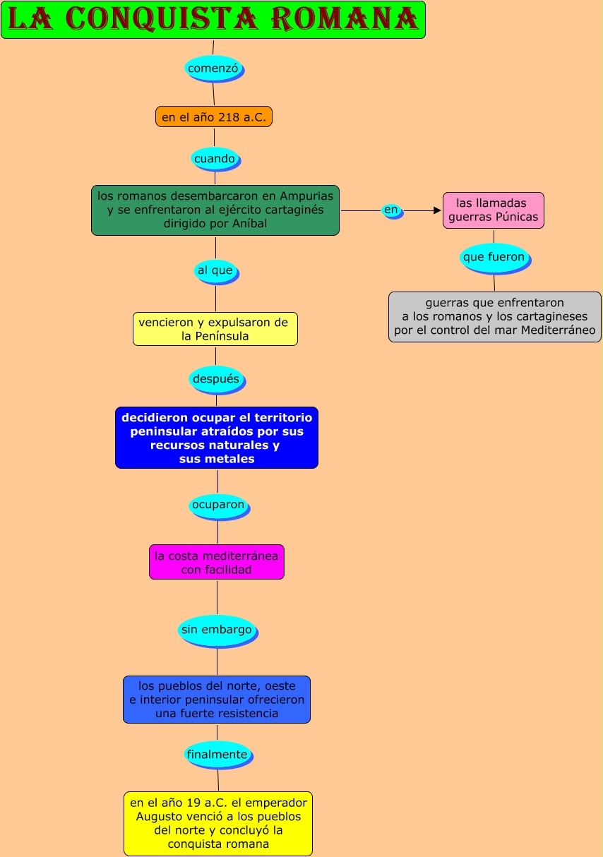 Este Cmap, tiene información relacionada con: La conquista romana, vencieron y expulsaron de la Península después decidieron ocupar el territorio peninsular atraídos por sus recursos naturales y sus metales, los romanos desembarcaron en Ampurias y se enfrentaron al ejército cartaginés dirigido por Aníbal en las llamadas guerras Púnicas, las llamadas guerras Púnicas que fueron guerras que enfrentaron a los romanos y los cartagineses por el control del mar Mediterráneo, los romanos desembarcaron en Ampurias y se enfrentaron al ejército cartaginés dirigido por Aníbal al que vencieron y expulsaron de la Península, decidieron ocupar el territorio peninsular atraídos por sus recursos naturales y sus metales ocuparon la costa mediterránea con facilidad, la costa mediterránea con facilidad sin embargo los pueblos del norte, oeste e interior peninsular ofrecieron una fuerte resistencia, La conquista romana comenzó en el año 218 a.C., los pueblos del norte, oeste e interior peninsular ofrecieron una fuerte resistencia finalmente en el año 19 a.C. el emperador Augusto venció a los pueblos del norte y concluyó la conquista romana, en el año 218 a.C. cuando los romanos desembarcaron en Ampurias y se enfrentaron al ejército cartaginés dirigido por Aníbal