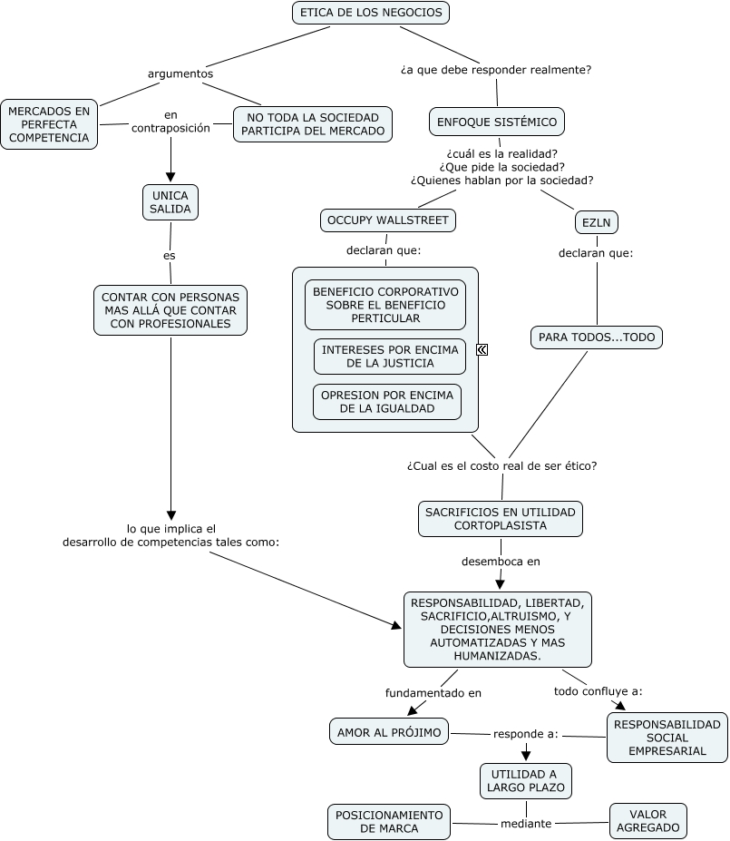 Este Cmap, tiene información relacionada con: ensayo de cultura etica, MERCADOS EN PERFECTA COMPETENCIA en contraposición NO TODA LA SOCIEDAD PARTICIPA DEL MERCADO, PARA TODOS...TODO ¿Cual es el costo real de ser ético? SACRIFICIOS EN UTILIDAD CORTOPLASISTA, UNICA SALIDA es CONTAR CON PERSONAS MAS ALLÁ QUE CONTAR CON PROFESIONALES, RESPONSABILIDAD, LIBERTAD, SACRIFICIO,ALTRUISMO, Y DECISIONES MENOS AUTOMATIZADAS Y MAS HUMANIZADAS. todo confluye a: RESPONSABILIDAD SOCIAL EMPRESARIAL, ENFOQUE SISTÉMICO ¿cuál es la realidad? ¿Que pide la sociedad? ¿Quienes hablan por la sociedad? EZLN, MERCADOS EN PERFECTA COMPETENCIA en contraposición UNICA SALIDA, CONTAR CON PERSONAS MAS ALLÁ QUE CONTAR CON PROFESIONALES lo que implica el desarrollo de competencias tales como: RESPONSABILIDAD, LIBERTAD, SACRIFICIO,ALTRUISMO, Y DECISIONES MENOS AUTOMATIZADAS Y MAS HUMANIZADAS., SACRIFICIOS EN UTILIDAD CORTOPLASISTA desemboca en RESPONSABILIDAD, LIBERTAD, SACRIFICIO,ALTRUISMO, Y DECISIONES MENOS AUTOMATIZADAS Y MAS HUMANIZADAS., ETICA DE LOS NEGOCIOS argumentos NO TODA LA SOCIEDAD PARTICIPA DEL MERCADO, ENFOQUE SISTÉMICO ¿cuál es la realidad? ¿Que pide la sociedad? ¿Quienes hablan por la sociedad? OCCUPY WALLSTREET, EZLN declaran que: PARA TODOS...TODO, UTILIDAD A LARGO PLAZO mediante VALOR AGREGADO, RESPONSABILIDAD SOCIAL EMPRESARIAL responde a: UTILIDAD A LARGO PLAZO, ???? ¿Cual es el costo real de ser ético? SACRIFICIOS EN UTILIDAD CORTOPLASISTA, UTILIDAD A LARGO PLAZO mediante POSICIONAMIENTO DE MARCA, ETICA DE LOS NEGOCIOS ¿a que debe responder realmente? ENFOQUE SISTÉMICO, AMOR AL PRÓJIMO responde a: UTILIDAD A LARGO PLAZO, ETICA DE LOS NEGOCIOS argumentos MERCADOS EN PERFECTA COMPETENCIA, OCCUPY WALLSTREET declaran que: ????, RESPONSABILIDAD, LIBERTAD, SACRIFICIO,ALTRUISMO, Y DECISIONES MENOS AUTOMATIZADAS Y MAS HUMANIZADAS. fundamentado en AMOR AL PRÓJIMO