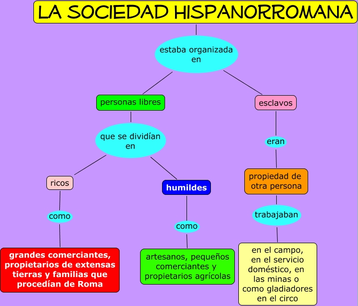 Este Cmap, tiene información relacionada con: La sociedad hispanoromana, ricos como grandes comerciantes, propietarios de extensas tierras y familias que procedían de Roma, personas libres que se dividían en ricos, La sociedad hispanorromana estaba organizada en esclavos, esclavos eran propiedad de otra persona, personas libres que se dividían en humildes, humildes como artesanos, pequeños comerciantes y propietarios agrícolas, La sociedad hispanorromana estaba organizada en personas libres, propiedad de otra persona trabajaban en el campo, en el servicio doméstico, en las minas o como gladiadores en el circo