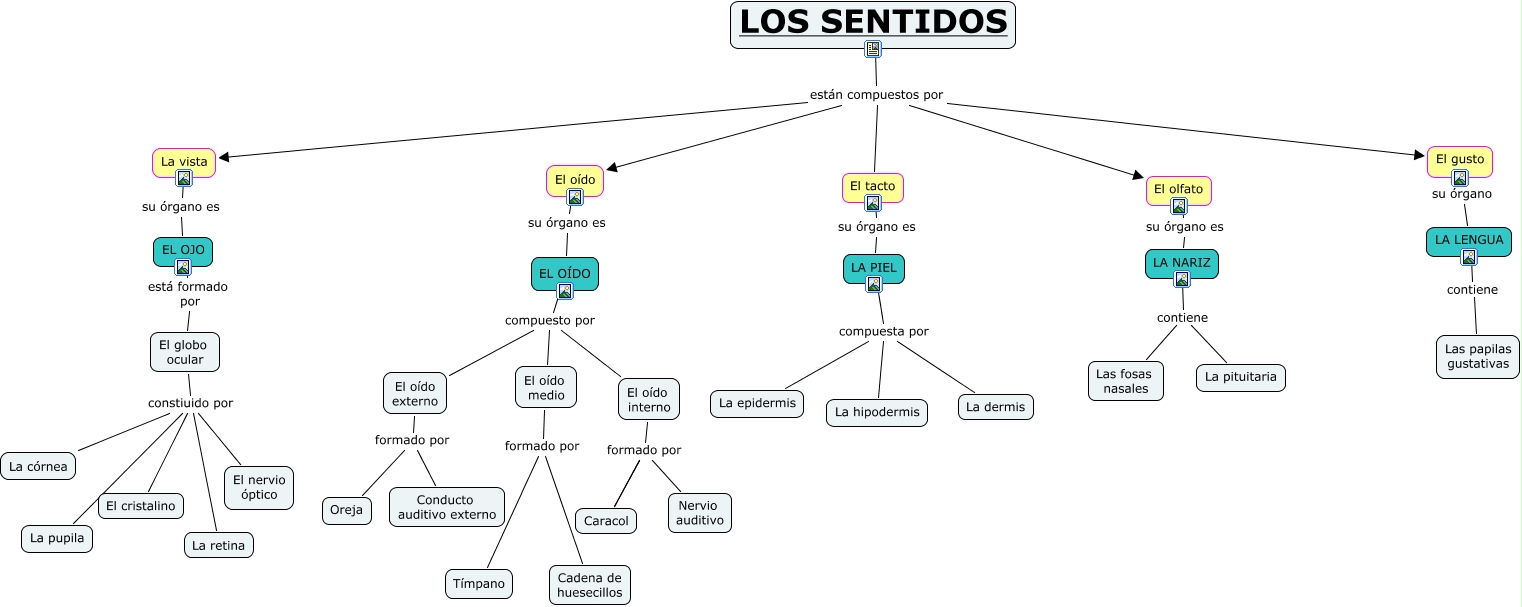 Este Cmap, tiene información relacionada con: Los sentidos, EL OÍDO compuesto por El oído medio, El globo ocular constiuido por El nervio óptico, LA PIEL compuesta por La dermis, El globo ocular constiuido por La córnea, LA NARIZ contiene La pituitaria, El oído medio formado por Tímpano, El globo ocular constiuido por La retina, El oído interno formado por Nervio auditivo, El globo ocular constiuido por El cristalino, EL OÍDO compuesto por El oído interno, El olfato su órgano es LA NARIZ, LOS SENTIDOS están compuestos por La vista, El globo ocular constiuido por La pupila, El oído su órgano es EL OÍDO, El gusto su órgano LA LENGUA, LOS SENTIDOS están compuestos por El olfato, LA LENGUA contiene Las papilas gustativas, LOS SENTIDOS están compuestos por El oído, LA NARIZ contiene Las fosas nasales, LOS SENTIDOS están compuestos por El tacto