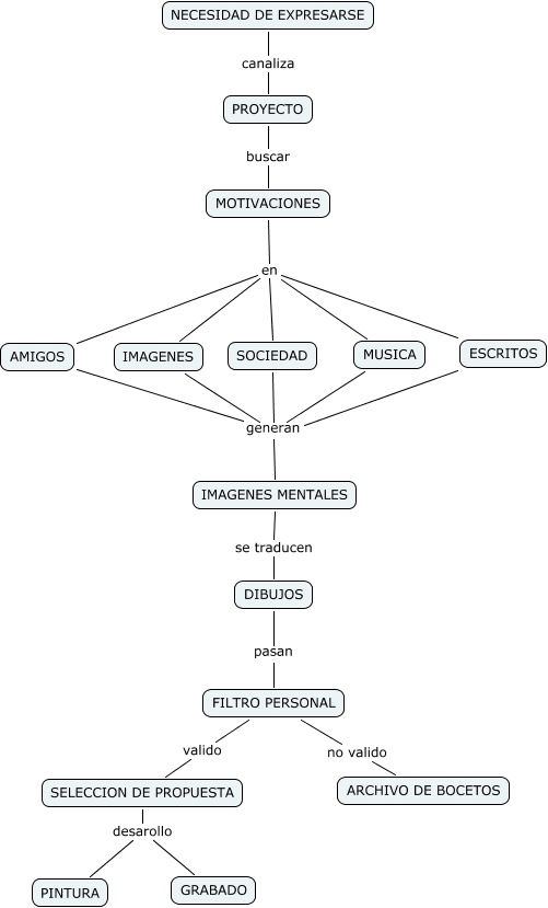 Este Cmap, tiene información relacionada con: MAPA CONCEPTUAL, MOTIVACIONES en ESCRITOS, SELECCION DE PROPUESTA desarollo PINTURA, ESCRITOS generan IMAGENES MENTALES, MOTIVACIONES en MUSICA, DIBUJOS pasan FILTRO PERSONAL, PROYECTO buscar MOTIVACIONES, MOTIVACIONES en IMAGENES, FILTRO PERSONAL no valido ARCHIVO DE BOCETOS, MOTIVACIONES en SOCIEDAD, FILTRO PERSONAL valido SELECCION DE PROPUESTA, MUSICA generan IMAGENES MENTALES, SELECCION DE PROPUESTA desarollo GRABADO, IMAGENES MENTALES se traducen DIBUJOS, AMIGOS generan IMAGENES MENTALES, IMAGENES generan IMAGENES MENTALES, NECESIDAD DE EXPRESARSE canaliza PROYECTO, MOTIVACIONES en AMIGOS, SOCIEDAD generan IMAGENES MENTALES