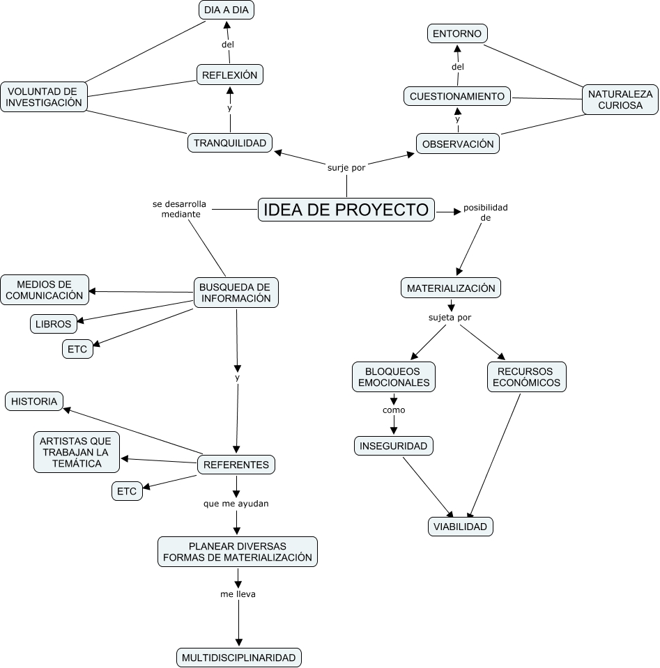 Este Cmap, tiene información relacionada con: como proyecto, INSEGURIDAD ???? VIABILIDAD, TRANQUILIDAD y REFLEXIÓN, REFERENTES que me ayudan PLANEAR DIVERSAS FORMAS DE MATERIALIZACIÓN, IDEA DE PROYECTO surje por TRANQUILIDAD, REFERENTES ???? ARTISTAS QUE TRABAJAN LA TEMÁTICA, RECURSOS ECONÓMICOS ???? VIABILIDAD, DIA A DIA ???? VOLUNTAD DE INVESTIGACIÓN, MATERIALIZACIÓN sujeta por RECURSOS ECONÓMICOS, IDEA DE PROYECTO se desarrolla mediante BUSQUEDA DE INFORMACIÓN, REFERENTES ???? ETC, OBSERVACIÓN ???? NATURALEZA CURIOSA, IDEA DE PROYECTO surje por OBSERVACIÓN, BUSQUEDA DE INFORMACIÓN ???? MEDIOS DE COMUNICACIÓN, PLANEAR DIVERSAS FORMAS DE MATERIALIZACIÓN me lleva MULTIDISCIPLINARIDAD, CUESTIONAMIENTO ???? NATURALEZA CURIOSA, BUSQUEDA DE INFORMACIÓN y REFERENTES, REFERENTES ???? HISTORIA, IDEA DE PROYECTO posibilidad de MATERIALIZACIÓN, OBSERVACIÓN y CUESTIONAMIENTO, MATERIALIZACIÓN sujeta por BLOQUEOS EMOCIONALES