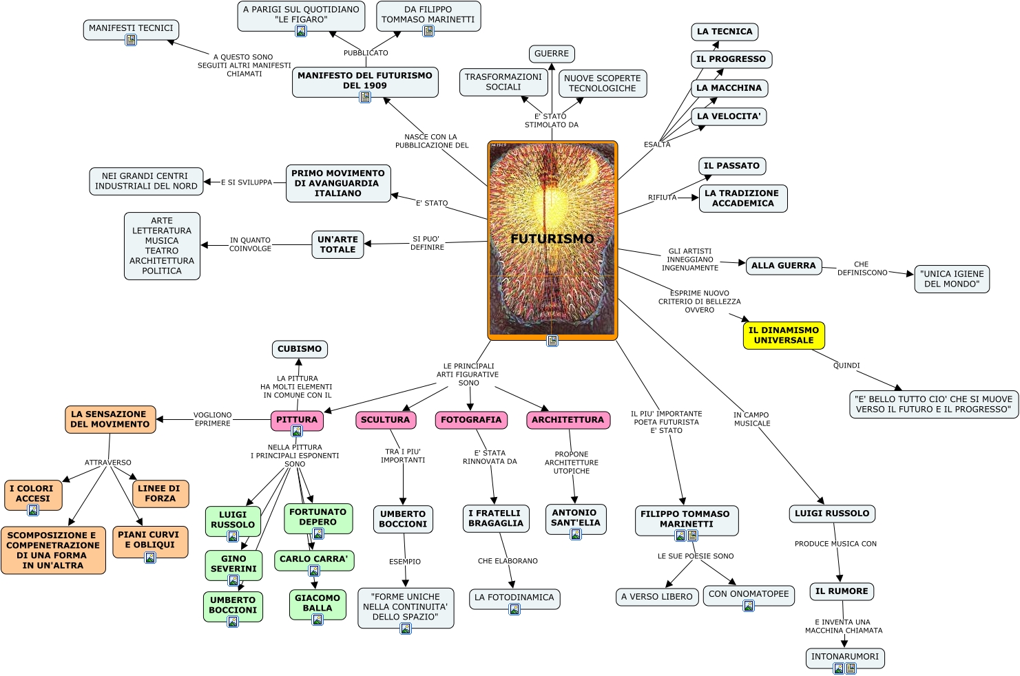 Questa Cmap, creata con IHMC CmapTools, contiene informazioni relative a: FUTURISMO, SCULTURA TRA I PIU' IMPORTANTI UMBERTO BOCCIONI, PITTURA VOGLIONO EPRIMERE LA SENSAZIONE DEL MOVIMENTO, MANIFESTO DEL FUTURISMO DEL 1909 A QUESTO SONO SEGUITI ALTRI MANIFESTI CHIAMATI MANIFESTI TECNICI, FUTURISMO RIFIUTA IL PASSATO, I FRATELLI BRAGAGLIA CHE ELABORANO LA FOTODINAMICA, FUTURISMO LE PRINCIPALI ARTI FIGURATIVE SONO PITTURA, FUTURISMO ESPRIME NUOVO CRITERIO DI BELLEZZA OVVERO IL DINAMISMO UNIVERSALE, PITTURA NELLA PITTURA I PRINCIPALI ESPONENTI SONO LUIGI RUSSOLO, FUTURISMO LE PRINCIPALI ARTI FIGURATIVE SONO SCULTURA, FUTURISMO E' STATO STIMOLATO DA NUOVE SCOPERTE TECNOLOGICHE, PITTURA NELLA PITTURA I PRINCIPALI ESPONENTI SONO GIACOMO BALLA, ARCHITETTURA PROPONE ARCHITETTURE UTOPICHE ANTONIO SANT'ELIA, FUTURISMO RIFIUTA LA TRADIZIONE ACCADEMICA, FUTURISMO LE PRINCIPALI ARTI FIGURATIVE SONO FOTOGRAFIA, PITTURA NELLA PITTURA I PRINCIPALI ESPONENTI SONO UMBERTO BOCCIONI, FOTOGRAFIA E' STATA RINNOVATA DA I FRATELLI BRAGAGLIA, FUTURISMO IN CAMPO MUSICALE LUIGI RUSSOLO, PITTURA LA PITTURA HA MOLTI ELEMENTI IN COMUNE CON IL CUBISMO, FILIPPO TOMMASO MARINETTI LE SUE POESIE SONO A VERSO LIBERO, PITTURA NELLA PITTURA I PRINCIPALI ESPONENTI SONO CARLO CARRA'