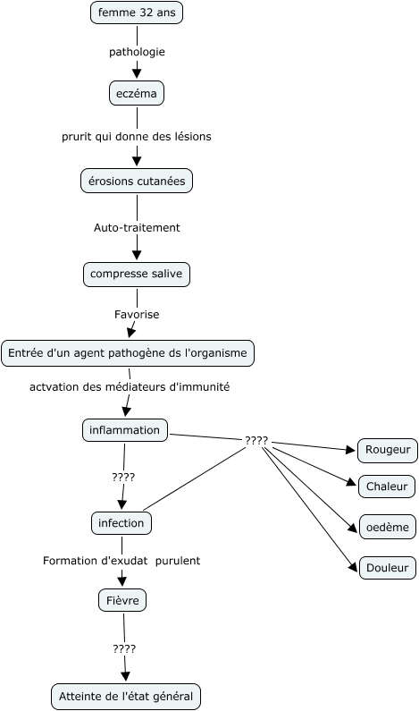 Cette carte de concepts créée avec IHMC CmapTools traite de: Exercices, infection Formation d'exudat purulent Fièvre, compresse salive Favorise Entrée d'un agent pathogène ds l'organisme, infection ???? Rougeur, inflammation ???? Rougeur, infection ???? Chaleur, inflammation ???? Douleur, infection ???? Douleur, inflammation ???? infection, eczéma prurit qui donne des lésions érosions cutanées, infection ???? oedème, érosions cutanées Auto-traitement compresse salive, inflammation ???? Chaleur, Fièvre ???? Atteinte de l'état général, femme 32 ans pathologie eczéma, inflammation ???? oedème, Entrée d'un agent pathogène ds l'organisme actvation des médiateurs d'immunité inflammation