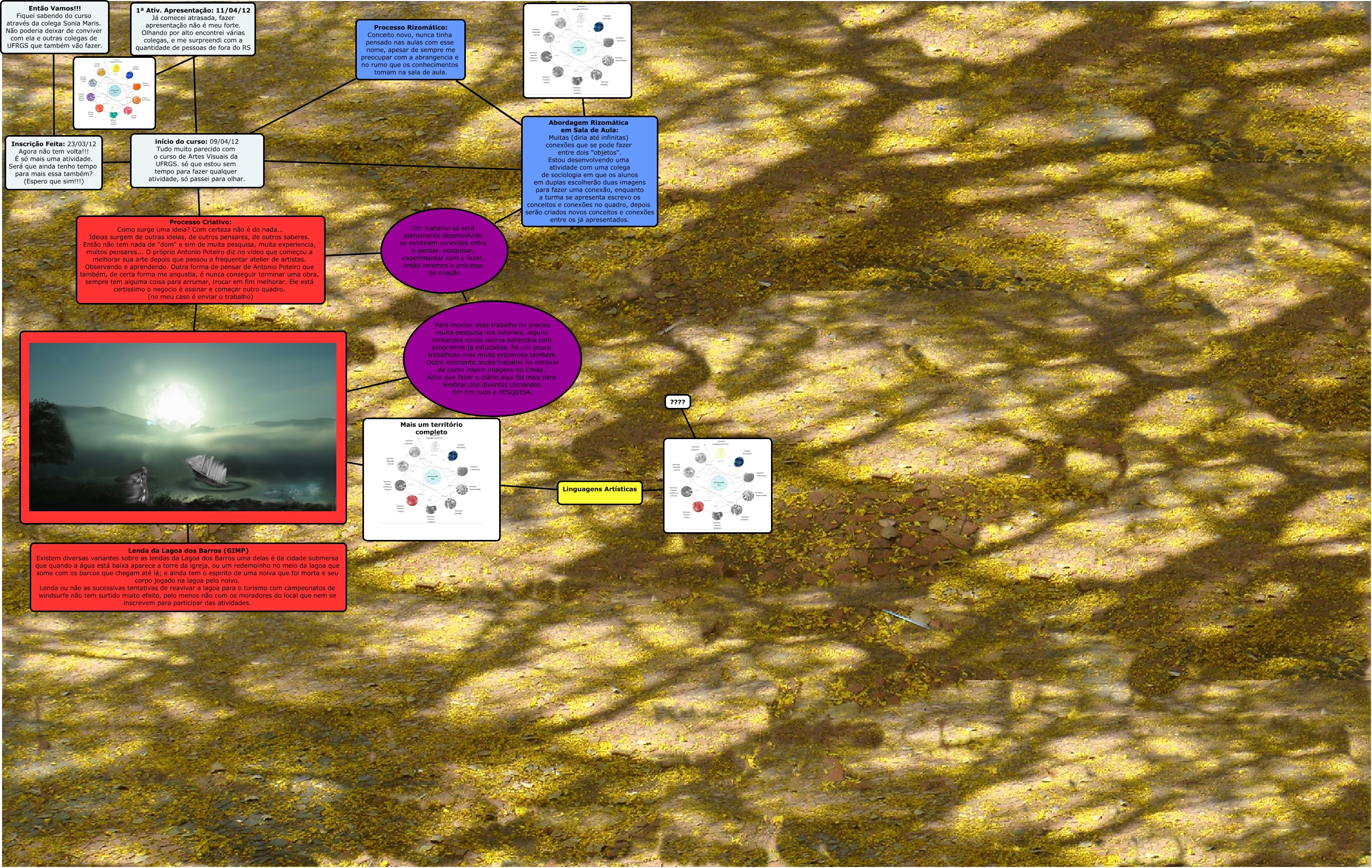 Esse mapa conceitual, produzido no IHMC CmapTools, tem a informação relacionada a: Diário de Bordo (Re)Significando, Um trabalho só será plenamente desenvolvido se existirem conexões entre o pensar, pesquisar, experimentar com o fazer, então teremos o processo de criação Abordagem Rizomática em Sala de Aula: Muitas (diria até infinitas) conexões que se pode fazer entre dois "objetos". Estou desenvolvendo uma atividade com uma colega de sociologia em que os alunos em duplas escolherão duas imagens para fazer uma conexão, enquanto a turma se apresenta escrevo os conceitos e conexões no quadro, depois serão criados novos conceitos e conexões entre os já apresentados. Processo Rizomático: Conceito novo, nunca tinha pensado nas aulas com esse nome, apesar de sempre me preocupar com a abrangencia e no rumo que os conhecimentos tomam na sala de aula., ???? Lenda da Lagoa dos Barros (GIMP) Existem diversas variantes sobre as lendas da Lagoa dos Barros uma delas é da cidade submersa que quando a água está baixa aparece a torre da igreja, ou um redemoinho no meio da lagoa que some com os barcos que chegam até lá; e ainda tem o espirito de uma noiva que foi morta e seu corpo jogado na lagoa pelo noivo. Lenda ou não as sucessivas tentativas de reavivar a lagoa para o turismo com campeonatos de windsurfe não tem surtido muito efeito, pelo menos não com os moradores do local que nem se inscrevem para participar das atividades., Processo Rizomático: Conceito novo, nunca tinha pensado nas aulas com esse nome, apesar de sempre me preocupar com a abrangencia e no rumo que os conhecimentos tomam na sala de aula. Abordagem Rizomática em Sala de Aula: Muitas (diria até infinitas) conexões que se pode fazer entre dois "objetos". Estou desenvolvendo uma atividade com uma colega de sociologia em que os alunos em duplas escolherão duas imagens para fazer uma conexão, enquanto a turma se apresenta escrevo os conceitos e conexões no quadro, depois serão criados novos conceitos e conexões entre os já apresentados. início do curso: 09/04/12 Tudo muito parecido com o curso de Artes Visuais da UFRGS. só que estou sem tempo para fazer qualquer atividade, só passei para olhar., Processo Rizomático: Conceito novo, nunca tinha pensado nas aulas com esse nome, apesar de sempre me preocupar com a abrangencia e no rumo que os conhecimentos tomam na sala de aula. início do curso: 09/04/12 Tudo muito parecido com o curso de Artes Visuais da UFRGS. só que estou sem tempo para fazer qualquer atividade, só passei para olhar., início do curso: 09/04/12 Tudo muito parecido com o curso de Artes Visuais da UFRGS. só que estou sem tempo para fazer qualquer atividade, só passei para olhar. Inscrição Feita: 23/03/12 Agora não tem volta!!! É só mais uma atividade. Será que ainda tenho tempo para mais essa também? (Espero que sim!!!) Então Vamos!!! Fiquei sabendo do curso através da colega Sonia Maris. Não poderia deixar de conviver com ela e outras colegas de UFRGS que também vão fazer., Linguagens Artísticas ????, Um trabalho só será plenamente desenvolvido se existirem conexões entre o pensar, pesquisar, experimentar com o fazer, então teremos o processo de criação Abordagem Rizomática em Sala de Aula: Muitas (diria até infinitas) conexões que se pode fazer entre dois "objetos". Estou desenvolvendo uma atividade com uma colega de sociologia em que os alunos em duplas escolherão duas imagens para fazer uma conexão, enquanto a turma se apresenta escrevo os conceitos e conexões no quadro, depois serão criados novos conceitos e conexões entre os já apresentados. início do curso: 09/04/12 Tudo muito parecido com o curso de Artes Visuais da UFRGS. só que estou sem tempo para fazer qualquer atividade, só passei para olhar., Processo Rizomático: Conceito novo, nunca tinha pensado nas aulas com esse nome, apesar de sempre me preocupar com a abrangencia e no rumo que os conhecimentos tomam na sala de aula. Abordagem Rizomática em Sala de Aula: Muitas (diria até infinitas) conexões que se pode fazer entre dois "objetos". Estou desenvolvendo uma atividade com uma colega de sociologia em que os alunos em duplas escolherão duas imagens para fazer uma conexão, enquanto a turma se apresenta escrevo os conceitos e conexões no quadro, depois serão criados novos conceitos e conexões entre os já apresentados. início do curso: 09/04/12 Tudo muito parecido com o curso de Artes Visuais da UFRGS. só que estou sem tempo para fazer qualquer atividade, só passei para olhar., início do curso: 09/04/12 Tudo muito parecido com o curso de Artes Visuais da UFRGS. só que estou sem tempo para fazer qualquer atividade, só passei para olhar. ???? 1ª Ativ. Apresentação: 11/04/12 Já comecei atrasada, fazer apresentação não é meu forte. Olhando por alto encontrei várias colegas, e me surpreendi com a quantidade de pessoas de fora do RS, Para montar esse trabalho foi preciso muita pesquisa nos tutoriais, alguns comandos novos outros parecidos com programas já estudados, foi um pouco trabalhoso mas muito prazeroso também. Outro momento muito trabalho foi lembrar de como inserir imagens no Cmap. Acho que fazer o diário aqui foi mais para lembrar dos diversos comandos. Em fim tudo é PESQUISA. Um trabalho só será plenamente desenvolvido se existirem conexões entre o pensar, pesquisar, experimentar com o fazer, então teremos o processo de criação, início do curso: 09/04/12 Tudo muito parecido com o curso de Artes Visuais da UFRGS. só que estou sem tempo para fazer qualquer atividade, só passei para olhar. Processo Criativo: Como surge uma ideia? Com certeza não é do nada... Ideias surgem de outras ideias, de outros pensares, de outros saberes. Então não tem nada de "dom" e sim de muita pesquisa, muita experiencia, muitos pensares... O próprio Antonio Poteiro diz no vídeo que começou a melhorar sua arte depois que passou a frequentar atelier de artistas. Obser