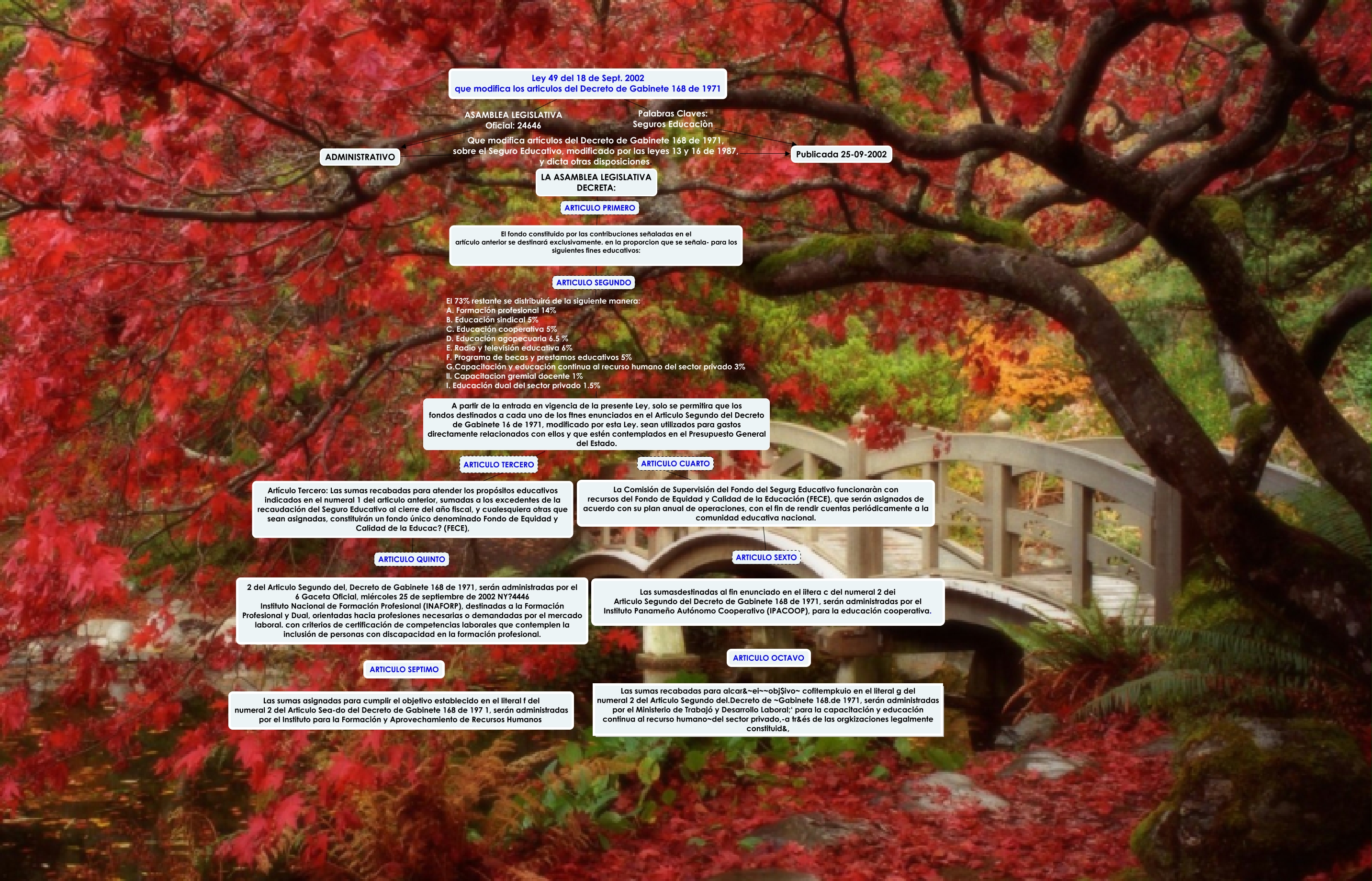Este Cmap, tiene información relacionada con: Sin Título 1, LA ASAMBLEA LEGISLATIVA DECRETA: QUE El fondo constituido por las contribuciones señaladas en eI artículo anterior se destinará exclusivamente. en la proporcion que se señala- para los siguientes fines educativos:, El fondo constituido por las contribuciones señaladas en eI artículo anterior se destinará exclusivamente. en la proporcion que se señala- para los siguientes fines educativos: EI 73% restante se distribuirá de la siguiente manera: A. Formación profesional 14% B. Educación sindical 5% C. Educación cooperativa 5% D. Educación agopecuaria 6.5 % E. Radio y televisión educativa 6% F. Programa de becas y prestamos educativos 5% G.Capacitación y educación continua al recurso humano del sector privado 3% ll. Capacitacion gremial docente 1% I. Educación dual del sector privado 1.5% A partir de la entrada en vigencia de la presente Ley, solo se permitira que los fondos destinados a cada uno de los ftnes enunciados en el Articulo Segundo del Decreto de Gabinete 16 de 1971, modificado por esta Ley. sean utilizados para gastos directamente relacionados con ellos y que estén contemplados en el Presupuesto General del Estado., ADMINISTRATIVO Que modifica artículos del Decreto de Gabinete 168 de 1971, sobre el Seguro Educativo, modificado por las leyes 13 y 16 de 1987, y dicta otras disposiciones. Publicada 25-09-2002, ADMINISTRATIVO Que modifica artículos del Decreto de Gabinete 168 de 1971, sobre el Seguro Educativo, modificado por las leyes 13 y 16 de 1987, y dicta otras disposiciones. LA ASAMBLEA LEGISLATIVA DECRETA:, Artículo Tercero: Las sumas recabadas para atender los propósitos educativos indicados en el numeral 1 del articulo anterior, sumadas a los excedentes de la recaudación del Seguro Educativo al cierre del año fiscal, y cualesquiera otras que sean asignadas, constituirán un fondo único denominado Fondo de Equidad y Calidad de la Educac? (FECE), ???? ARTICULO QUINTO, Ley 49 del 18 de Sept. 2002 que modifica los articulos del Decreto de Gabinete 168 de 1971 Palabras Claves: Seguros Educaciòn Publicada 25-09-2002, A partir de la entrada en vigencia de la presente Ley, solo se permitira que los fondos destinados a cada uno de los ftnes enunciados en el Articulo Segundo del Decreto de Gabinete 16 de 1971, modificado por esta Ley. sean utilizados para gastos directamente relacionados con ellos y que estén contemplados en el Presupuesto General del Estado. La Comisión de Supervisión del Fondo del Segurg Educativo funcionaràn con recursos del Fondo de Equidad y Calidad de la Educación (FECE), que serán asignados de acuerdo con su plan anual de operaciones, con el fin de rendir cuentas periódicamente a la comunidad educativa nacional., Ley 49 del 18 de Sept. 2002 que modifica los articulos del Decreto de Gabinete 168 de 1971 ASAMBLEA LEGISLATIVA Oficial: 24646 ADMINISTRATIVO, A partir de la entrada en vigencia de la presente Ley, solo se permitira que los fondos destinados a cada uno de los ftnes enunciados en el Articulo Segundo del Decreto de Gabinete 16 de 1971, modificado por esta Ley. sean utilizados para gastos directamente relacionados con ellos y que estén contemplados en el Presupuesto General del Estado. Artículo Tercero: Las sumas recabadas para atender los propósitos educativos indicados en el numeral 1 del articulo anterior, sumadas a los excedentes de la recaudación del Seguro Educativo al cierre del año fiscal, y cualesquiera otras que sean asignadas, constituirán un fondo único denominado Fondo de Equidad y Calidad de la Educac? (FECE),, La Comisión de Supervisión del Fondo del Segurg Educativo funcionaràn con recursos del Fondo de Equidad y Calidad de la Educación (FECE), que serán asignados de acuerdo con su plan anual de operaciones, con el fin de rendir cuentas periódicamente a la comunidad educativa nacional. ???? ARTICULO SEXTO