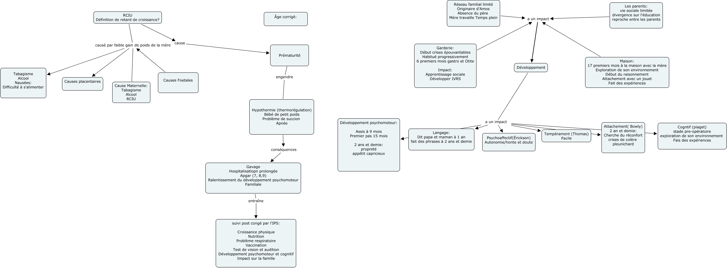 This Concept Map, created with IHMC CmapTools, has information related to: Problème 1 (groupe1), RCIU Définition de retard de croissance? cause Prématurité, Développement a un impact Langage: Dit papa et maman à 1 an fait des phrases à 2 ans et demie, Causes Foetales causé par faible gain de poids de la mère Tabagisme Alcool Nausées: Difficulté à s'alimenter, Hypothermie (thermorégulation) Bébé de petit poids Problème de succion Apnée conséquences Gavage Hospitalisatiopn prolongée Apgar (7, 8,9) Ralentissement du développement psychomoteur Familiale, Causes Foetales causé par faible gain de poids de la mère Causes placentaires, Prématurité engendre Hypothermie (thermorégulation) Bébé de petit poids Problème de succion Apnée, Développement a un impact Cogntif (piaget) stade pre-opératoire exploration de son environnement Fais des expériences, Réseau familial limité Originaire d'Amos Absence du père Mère travaille Temps plein a un impact Développement, Développement a un impact Psychoaffectif(Érickson) Autonomie/honte et doute, Cause Maternelle: Tabagisme Alcool RCIU causé par faible gain de poids de la mère Tabagisme Alcool Nausées: Difficulté à s'alimenter, Cause Maternelle: Tabagisme Alcool RCIU causé par faible gain de poids de la mère Causes placentaires, Développement a un impact Développement psychomoteur: Assis à 9 mois Premier pas 15 mois 2 ans et demie: propreté appétit capricieux, RCIU Définition de retard de croissance? causé par faible gain de poids de la mère Causes placentaires, Maison: 17 premiers mois à la maison avec la mère Exploration de son environnement Début du raisonnement Attachement avec un jouet Fait des expériences a un impact Développement, Développement a un impact Attachement( Bowly) 2 an et demie: Cherche du réconfort crises de colère pleunichard, Gavage Hospitalisatiopn prolongée Apgar (7, 8,9) Ralentissement du développement psychomoteur Familiale entraîne suivi post congé par l'IPS: Croissance physique Nutrition Problème respiratoire Vaccination Test de vision et audition Développement psychomoteur et cognitif Impact sur la famille, Développement a un impact Tempérament (Thomas) Facile, RCIU Définition de retard de croissance? causé par faible gain de poids de la mère Tabagisme Alcool Nausées: Difficulté à s'alimenter, Les parents: vie sociale limitée divergence sur l'éducation reproche entre les parents a un impact Développement, Garderie: Début crises épouvantables Habitué progressivement 6 premiers mois gastro et Otite Impact: Apprentissage sociale Développer IVRS a un impact Développement