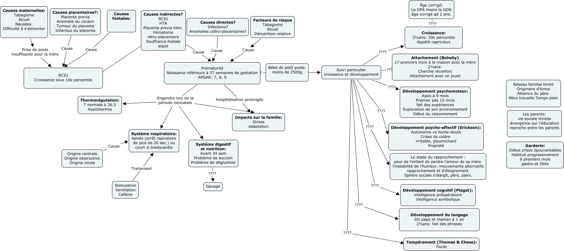 Cette carte de concepts créée avec IHMC CmapTools traite de: Problème 1 (groupe1) Mélanie Babin, Suivi particulier croissance et développement ???? Le stade du rapprochement : peur de l'enfant de perdre l'amour de sa mère l'instabilité de l'humeur, mouvements alternatifs rapprochement et d'éloignement. Sphère sociale s'élargit, père, pairs., Prématurité Naissance inférieure à 37 semaines de gestation APGAR: 7, 8, 9 Engendre lors de la période néonatale Système digestif et nutrition: Avant 34 sem Problème de succion Problème de déglutition, Suivi particulier croissance et développement ???? ????, Prématurité Naissance inférieure à 37 semaines de gestation APGAR: 7, 8, 9 Engendre lors de la période néonatale Système respiratoire: Apnée (arrêt repiratoire de plus de 20 sec.) ou court si bradycardie, Facteurs de risque Tabagisme Alcool Dénutrition relative Cause Prématurité Naissance inférieure à 37 semaines de gestation APGAR: 7, 8, 9, Suivi particulier croissance et développement ???? Développement psychomoteur: Assis à 9 mois Premier pas 15 mois fait des expériences Exploration de son environnement Début du raisonnement, Causes indirectes? RCIU HTA Placenta previa hém. Hématome rétro-placentaire Souffrance foetale aiguë ???? RCIU Croissance sous 10e percentile, Causes indirectes? RCIU HTA Placenta previa hém. Hématome rétro-placentaire Souffrance foetale aiguë Cause Prématurité Naissance inférieure à 37 semaines de gestation APGAR: 7, 8, 9, Causes directes? Infections? Anomalies utéro-placentaires? Cause Prématurité Naissance inférieure à 37 semaines de gestation APGAR: 7, 8, 9, Âge corrigé: La DPA moins la DDN âge corrigé ad 2 ans. ???? Croissance: 2½ans: 20e percentile Appétit capricieux, Suivi particulier croissance et développement ???? Attachement (Bolwby) 17 premiers mois à la maison avec la mère 2½ans: Cherche réconfort Attachement avec un jouet, Prématurité Naissance inférieure à 37 semaines de gestation APGAR: 7, 8, 9 Engendre lors de la période néonatale Impacts sur la famille: Stress Adaptation, Origine centrale Origine obstructive Origine mixte Cause Système respiratoire: Apnée (arrêt repiratoire de plus de 20 sec.) ou court si bradycardie, Suivi particulier croissance et développement ???? Croissance: 2½ans: 20e percentile Appétit capricieux, Prématurité Naissance inférieure à 37 semaines de gestation APGAR: 7, 8, 9 Hospitalisation prolongée Impacts sur la famille: Stress Adaptation, Suivi particulier croissance et développement ???? Développement du langage Dit papa et maman à 1 an 2½ans: fait des phrases, Causes foetales: Cause RCIU Croissance sous 10e percentile, Stimulation Ventilation Caféine Traitement Système respiratoire: Apnée (arrêt repiratoire de plus de 20 sec.) ou court si bradycardie, Suivi particulier croissance et développement ???? Développement cognitif (Piaget): intelligence préopératoire intelligence symbolique, Système digestif et nutrition: Avant 34 sem Problème de succion Problème de déglutition ???? Gavage