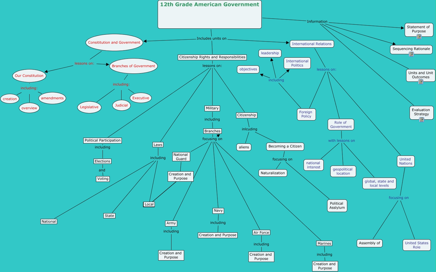 This Concept Map, created with IHMC CmapTools, has information related to: 12th Grade American Government, Role of Government with lessons on national interest, United Nations focusing on Assembly of, 12th Grade American Government Includes units on International Relations, Branches of Government including: Executive, Citizenship inlcuding Becoming a Citizen, 12th Grade American Government Information Evaluation Strategy, International Relations lessons on: Foreign Policy, National Guard ???? Local, Foreign Policy including leadership, Branches focusing on Marines, Laws including National, Our Constitution including: amendments, Branches focusing on Navy, Air Force including Creation and Purpose, Army including Creation and Purpose, Laws including State, Citizenship Rights and Responsibilities lessons on: Political Participation, Elections and Voting, Branches of Government including: Judicial, Political Participation including Elections