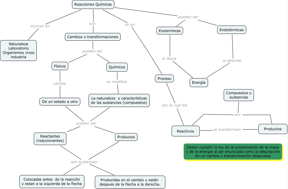 Este Cmap, tiene información relacionada con: Cmapecuacionesquimicas, Productos son Compuestos o sustancias, Cambios o transformaciones pueden ser Físicos, La naturaleza y características de las sustancias (compuestos) pueden ser Productos, Endotérmicas si absorbe Energía, Reactantes (reaccionantes) son sustancias Producidas en el cambio y están despues de la flecha a la derecha., Reacciones Químicas pueden ser Exotermicas, Exotermicas si libera Energía, De un estado a otro pueden ser Productos, Productos son sustancias Colocadas antes de la reacción y estan a la izquierda de la flecha, Químicos se modifica La naturaleza y características de las sustancias (compuestos), Reactantes (reaccionantes) son sustancias Colocadas antes de la reacción y estan a la izquierda de la flecha, Reacciones Químicas ocurren en Naturaleza Laboratorio Organismos vivos industria, Reacciones Químicas son Cambios o transformaciones, La naturaleza y características de las sustancias (compuestos) pueden ser Reactantes (reaccionantes), Reacciones Químicas pueden ser Endotérmicas, Reactivos son Compuestos o sustancias, Reacciones Químicas es un Proceso, Productos son sustancias Producidas en el cambio y están despues de la flecha a la derecha., Proceso por la cual los Reactivos, Reactivos se transforman Productos