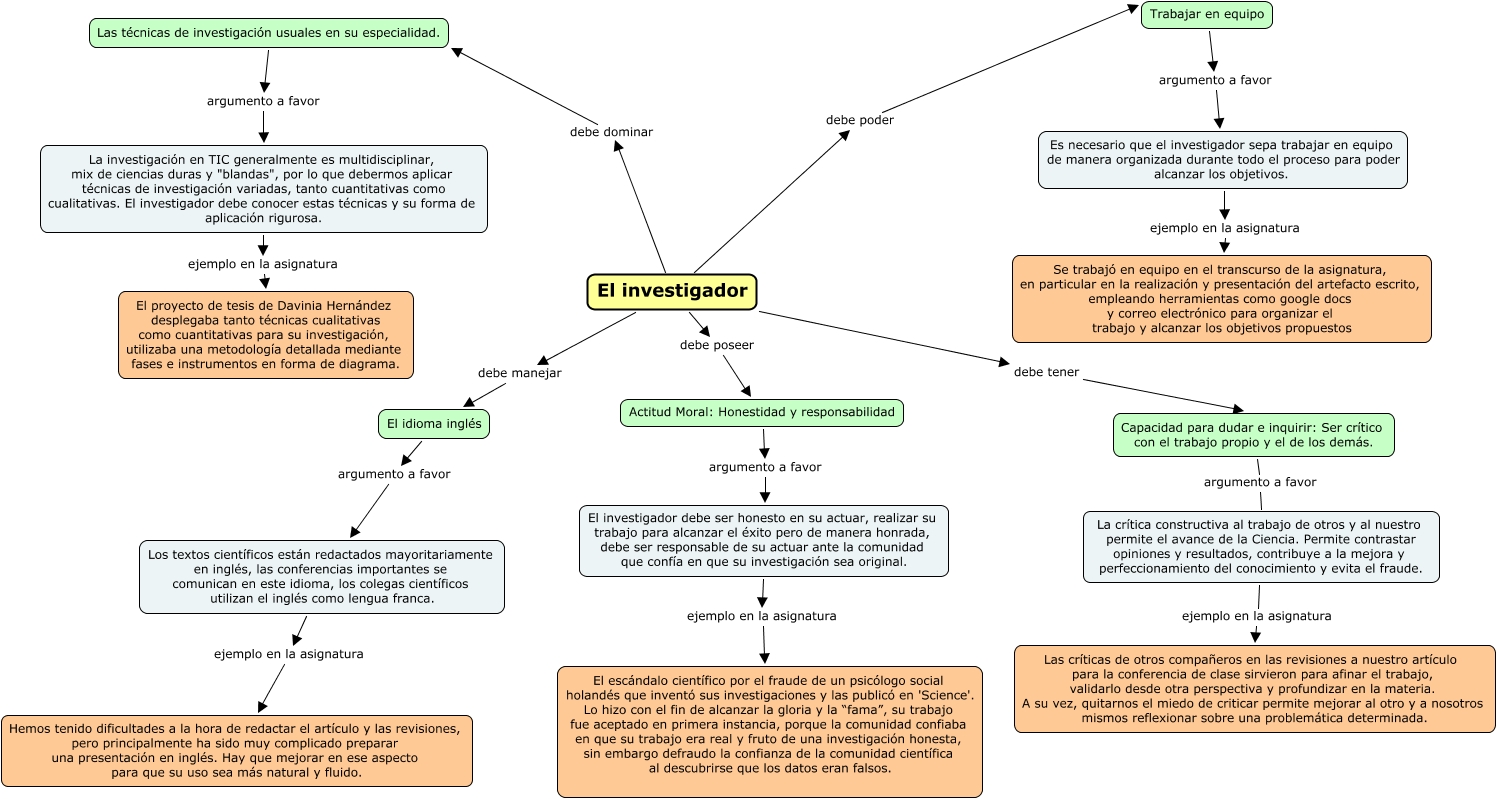 Este Cmap, tiene información relacionada con: Cualidades del investigador_3.cmap.cmap, El investigador debe manejar El idioma inglés, El idioma inglés argumento a favor Los textos científicos están redactados mayoritariamente en inglés, las conferencias importantes se comunican en este idioma, los colegas científicos utilizan el inglés como lengua franca., El investigador debe poder Trabajar en equipo, Los textos científicos están redactados mayoritariamente en inglés, las conferencias importantes se comunican en este idioma, los colegas científicos utilizan el inglés como lengua franca. ejemplo en la asignatura Hemos tenido dificultades a la hora de redactar el artículo y las revisiones, pero principalmente ha sido muy complicado preparar una presentación en inglés. Hay que mejorar en ese aspecto para que su uso sea más natural y fluido., Las técnicas de investigación usuales en su especialidad. argumento a favor La investigación en TIC generalmente es multidisciplinar, mix de ciencias duras y "blandas", por lo que debermos aplicar técnicas de investigación variadas, tanto cuantitativas como cualitativas. El investigador debe conocer estas técnicas y su forma de aplicación rigurosa., Es necesario que el investigador sepa trabajar en equipo de manera organizada durante todo el proceso para poder alcanzar los objetivos. ejemplo en la asignatura Se trabajó en equipo en el transcurso de la asignatura, en particular en la realización y presentación del artefacto escrito, empleando herramientas como google docs y correo electrónico para organizar el trabajo y alcanzar los objetivos propuestos, El investigador debe dominar Las técnicas de investigación usuales en su especialidad., El investigador debe ser honesto en su actuar, realizar su trabajo para alcanzar el éxito pero de manera honrada, debe ser responsable de su actuar ante la comunidad que confía en que su investigación sea original. ejemplo en la asignatura El escándalo científico por el fraude de un psicólogo social holandés que inventó sus investigaciones y las publicó en 'Science'. Lo hizo con el fin de alcanzar la gloria y la “fama”, su trabajo fue aceptado en primera instancia, porque la comunidad confiaba en que su trabajo era real y fruto de una investigación honesta, sin embargo defraudo la confianza de la comunidad científica al descubrirse que los datos eran falsos., El investigador debe poseer Actitud Moral: Honestidad y responsabilidad, Capacidad para dudar e inquirir: Ser crítico con el trabajo propio y el de los demás. argumento a favor La crítica constructiva al trabajo de otros y al nuestro permite el avance de la Ciencia. Permite contrastar opiniones y resultados, contribuye a la mejora y perfeccionamiento del conocimiento y evita el fraude., Trabajar en equipo argumento a favor Es necesario que el investigador sepa trabajar en equipo de manera organizada durante todo el proceso para poder alcanzar los objetivos., El investigador debe tener Capacidad para dudar e inquirir: Ser crítico con el trabajo propio y el de los demás., Actitud Moral: Honestidad y responsabilidad argumento a favor El investigador debe ser honesto en su actuar, realizar su trabajo para alcanzar el éxito pero de manera honrada, debe ser responsable de su actuar ante la comunidad que confía en que su investigación sea original., La crítica constructiva al trabajo de otros y al nuestro permite el avance de la Ciencia. Permite contrastar opiniones y resultados, contribuye a la mejora y perfeccionamiento del conocimiento y evita el fraude. ejemplo en la asignatura Las críticas de otros compañeros en las revisiones a nuestro artículo para la conferencia de clase sirvieron para afinar el trabajo, validarlo desde otra perspectiva y profundizar en la materia. A su vez, quitarnos el miedo de criticar permite mejorar al otro y a nosotros mismos reflexionar sobre una problemática determinada., La investigación en TIC generalmente es multidisciplinar, mix de ciencias duras y "blandas", por lo que debermos aplicar técnicas de investigación variadas, tanto cuantitativas como cualitativas. El investigador debe conocer estas técnicas y su forma de aplicación rigurosa. ejemplo en la asignatura El proyecto de tesis de Davinia Hernández desplegaba tanto técnicas cualitativas como cuantitativas para su investigación, utilizaba una metodología detallada mediante fases e instrumentos en forma de diagrama.