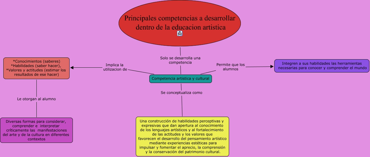 Este Cmap, tiene información relacionada con: PRINCIPALES COMPETENCIAS A DESARROLLAR DENTRO DE LA EDUCACION ARTISTICA, Competencia artistica y cultural Implica la utilizacion de *Conocimientos (saberes) *Habilidades (saber hacer), *Valores y actitudes (estimar los resultados de ese hacer), Competencia artistica y cultural Se conceptualiza como Una construcción de habilidades perceptivas y expresivas que dan apertura al conocimiento de los lenguajes artísticos y al fortalecimiento de las actitudes y los valores que favorecen el desarrollo del pensamiento artístico mediante experiencias estéticas para impulsar y fomentar el aprecio, la comprensión y la conservación del patrimonio cultural., *Conocimientos (saberes) *Habilidades (saber hacer), *Valores y actitudes (estimar los resultados de ese hacer) Le otorgan al alumno Diversas formas para considerar, comprender e interpretar críticamente las manifestaciones del arte y de la cultura en diferentes contextos, Principales competencias a desarrollar dentro de la educacion artistica Solo se desarrolla una competencia Competencia artistica y cultural, Competencia artistica y cultural Permite que los alumnos Integren a sus habilidades las herramientas necesarias para conocer y comprender el mundo