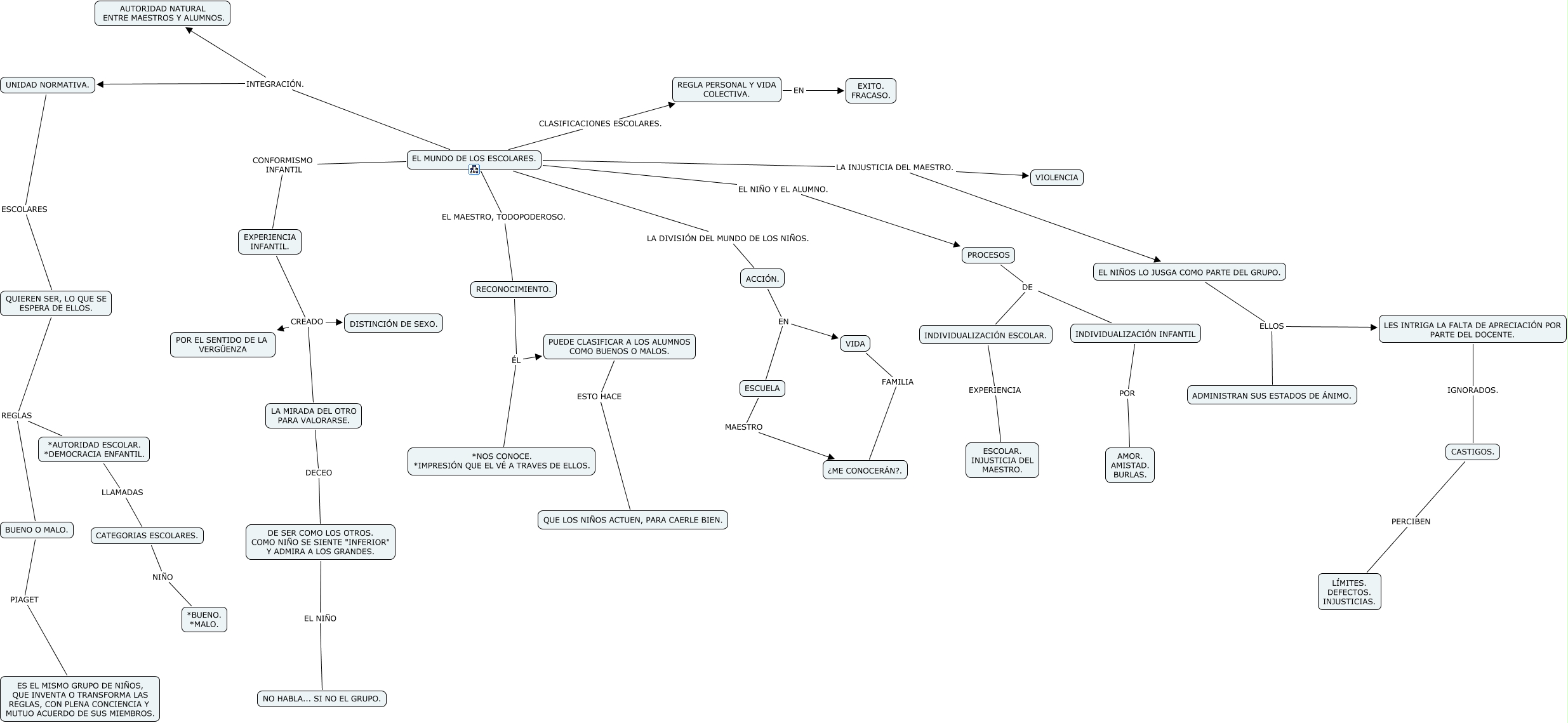 Este Cmap, tiene información relacionada con: EL MUNDO DE LOS ESCOLARES, EL MUNDO DE LOS ESCOLARES. EL NIÑO Y EL ALUMNO. PROCESOS, EL MUNDO DE LOS ESCOLARES. LA DIVISIÓN DEL MUNDO DE LOS NIÑOS. ACCIÓN., LES INTRIGA LA FALTA DE APRECIACIÓN POR PARTE DEL DOCENTE. IGNORADOS. CASTIGOS., RECONOCIMIENTO. ÉL *NOS CONOCE. *IMPRESIÓN QUE EL VÉ A TRAVES DE ELLOS., EXPERIENCIA INFANTIL. CREADO DISTINCIÓN DE SEXO., *AUTORIDAD ESCOLAR. *DEMOCRACIA ENFANTIL. LLAMADAS CATEGORIAS ESCOLARES., EL MUNDO DE LOS ESCOLARES. EL MAESTRO, TODOPODEROSO. RECONOCIMIENTO., ESCUELA MAESTRO ¿ME CONOCERÁN?., RECONOCIMIENTO. ÉL PUEDE CLASIFICAR A LOS ALUMNOS COMO BUENOS O MALOS., EL MUNDO DE LOS ESCOLARES. INTEGRACIÓN. UNIDAD NORMATIVA., EL MUNDO DE LOS ESCOLARES. CLASIFICACIONES ESCOLARES. REGLA PERSONAL Y VIDA COLECTIVA., DE SER COMO LOS OTROS. COMO NIÑO SE SIENTE "INFERIOR" Y ADMIRA A LOS GRANDES. EL NIÑO NO HABLA... SI NO EL GRUPO., PROCESOS DE INDIVIDUALIZACIÓN ESCOLAR., LA MIRADA DEL OTRO PARA VALORARSE. DECEO DE SER COMO LOS OTROS. COMO NIÑO SE SIENTE "INFERIOR" Y ADMIRA A LOS GRANDES., UNIDAD NORMATIVA. ESCOLARES QUIEREN SER, LO QUE SE ESPERA DE ELLOS., EXPERIENCIA INFANTIL. CREADO POR EL SENTIDO DE LA VERGÜENZA, EXPERIENCIA INFANTIL. CREADO LA MIRADA DEL OTRO PARA VALORARSE., QUIEREN SER, LO QUE SE ESPERA DE ELLOS. REGLAS BUENO O MALO., PUEDE CLASIFICAR A LOS ALUMNOS COMO BUENOS O MALOS. ESTO HACE QUE LOS NIÑOS ACTUEN, PARA CAERLE BIEN., EL MUNDO DE LOS ESCOLARES. LA INJUSTICIA DEL MAESTRO. EL NIÑOS LO JUSGA COMO PARTE DEL GRUPO.