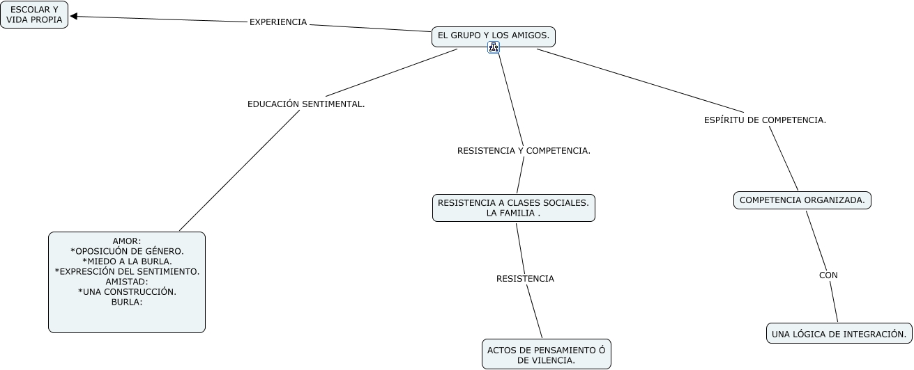 Este Cmap, tiene información relacionada con: EL GRUPO Y LOS AMIGOS, EL GRUPO Y LOS AMIGOS. ESPÍRITU DE COMPETENCIA. COMPETENCIA ORGANIZADA., RESISTENCIA A CLASES SOCIALES. LA FAMILIA . RESISTENCIA ACTOS DE PENSAMIENTO Ó DE VILENCIA., EL GRUPO Y LOS AMIGOS. EXPERIENCIA ESCOLAR Y VIDA PROPIA, EL GRUPO Y LOS AMIGOS. RESISTENCIA Y COMPETENCIA. RESISTENCIA A CLASES SOCIALES. LA FAMILIA ., EL GRUPO Y LOS AMIGOS. EDUCACIÓN SENTIMENTAL. AMOR: *OPOSICUÓN DE GÉNERO. *MIEDO A LA BURLA. *EXPRESCIÓN DEL SENTIMIENTO. AMISTAD: *UNA CONSTRUCCIÓN. BURLA:, COMPETENCIA ORGANIZADA. CON UNA LÓGICA DE INTEGRACIÓN.