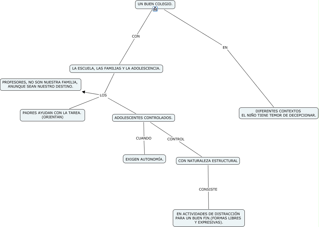 Este Cmap, tiene información relacionada con: AÑOS DE COLEGIO, LA ESCUELA, LAS FAMILIAS Y LA ADOLESCENCIA. LOS PROFESORES, NO SON NUESTRA FAMILIA, ANUNQUE SEAN NUESTRO DESTINO., LA ESCUELA, LAS FAMILIAS Y LA ADOLESCENCIA. LOS ADOLESCENTES CONTROLADOS., ADOLESCENTES CONTROLADOS. CUANDO EXIGEN AUTONOMÍA., UN BUEN COLEGIO. CON LA ESCUELA, LAS FAMILIAS Y LA ADOLESCENCIA., CON NATURALEZA ESTRUCTURAL CONSISTE EN ACTIVIDADES DE DISTRACCIÓN PARA UN BUEN FIN.(FORMAS LIBRES Y EXPRESIVAS)., LA ESCUELA, LAS FAMILIAS Y LA ADOLESCENCIA. LOS PADRES AYUDAN CON LA TAREA. (ORIENTAN), UN BUEN COLEGIO. EN DIFERENTES CONTEXTOS EL NIÑO TIENE TEMOR DE DECEPCIONAR., ADOLESCENTES CONTROLADOS. CONTROL CON NATURALEZA ESTRUCTURAL