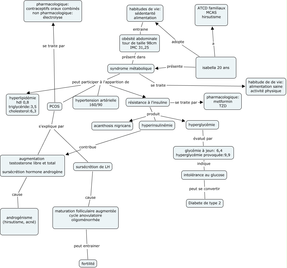 This Concept Map, created with IHMC CmapTools, has information related to: app 5 equipe 1, syndrome métabolique peut participer à l'apparition de résistance à l'insuline, obésité abdominale tour de taille 98cm IMC 31,25 présent dans syndrome métabolique, syndrome métabolique se traite habitude de de vie: alimentation saine activité physique, sursécrétion de LH cause maturation folliculaire augmentée cycle anovulatoire oligoménorrhée, isabella 20 ans adopte habitudes de vie: sédentarité alimentation, hyperglycémie évalué par glycémie à jeun: 6,4 hyperglycémie provoquée:9,9, intolérance au glucose peut se convertir Diabete de type 2, augmentation testosterone libre et total sursécrétion hormone androgène cause androgénisme (hirsutisme, acné), résistance à l'insuline produit hyperglycémie, PCOS s'explique par sursécrétion de LH, isabella 20 ans présente syndrome métabolique, isabella 20 ans a ATCD familiaux MCAS hirsutisme, glycémie à jeun: 6,4 hyperglycémie provoquée:9,9 indique intolérance au glucose, PCOS s'explique par augmentation testosterone libre et total sursécrétion hormone androgène, résistance à l'insuline produit acanthosis nigricans, habitudes de vie: sédentarité alimentation entraine obésité abdominale tour de taille 98cm IMC 31,25, résistance à l'insuline se traite par pharmacologique: metformin TZD, syndrome métabolique peut participer à l'apparition de PCOS, syndrome métabolique peut participer à l'apparition de hyperlipidémie hdl 0,8 triglycéride:3,5 cholesterol:6,3, syndrome métabolique peut participer à l'apparition de hypertension artérielle 160/90