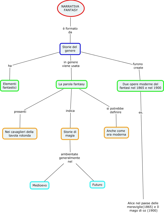 Questa Cmap, creata con IHMC CmapTools, contiene informazioni relative a: Storie-genere, Due opere moderne del fantasi nel 1865 e nel 1900 es. Alice nel paese delle meraviglie(1865) e Il mago di oz (1900), Storie del genere in genere viene usata La parola fantasy, Storie del genere furono create Due opere moderne del fantasi nel 1865 e nel 1900, Storie del genere ha Elementi fantastici, NARRATIVA FANTASY è formato da Storie del genere, Storie di magia ambientate generalmente nel Futuro, La parola fantasy si potrebbe definire Anche come era moderna, La parola fantasy presenti Nei cavaglieri della tavola rotonda, Storie di magia ambientate generalmente nel Medioevo, La parola fantasy indica Storie di magia