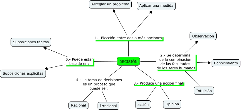Este Cmap, tiene información relacionada con: DECISIÓN, DECISIÓN 3.- Produce una acción final Opinión, DECISIÓN 5.- Puede estar basado en: Suposiciones explicitas, DECISIÓN 2.- Se determina de la combinación de las facultades de los seres humanos Observación, DECISIÓN 1.- Elección entre dos o más opciones Aplicar una medida, DECISIÓN 1.- Elección entre dos o más opciones Arreglar un problema, DECISIÓN 2.- Se determina de la combinación de las facultades de los seres humanos Conocimiento, DECISIÓN 5.- Puede estar basado en: Suposiciones tácitas, DECISIÓN 4.- La toma de decisiones es un proceso que puede ser: Irracional, DECISIÓN 4.- La toma de decisiones es un proceso que puede ser: Racional, DECISIÓN 2.- Se determina de la combinación de las facultades de los seres humanos Intuición, DECISIÓN 3.- Produce una acción final acción