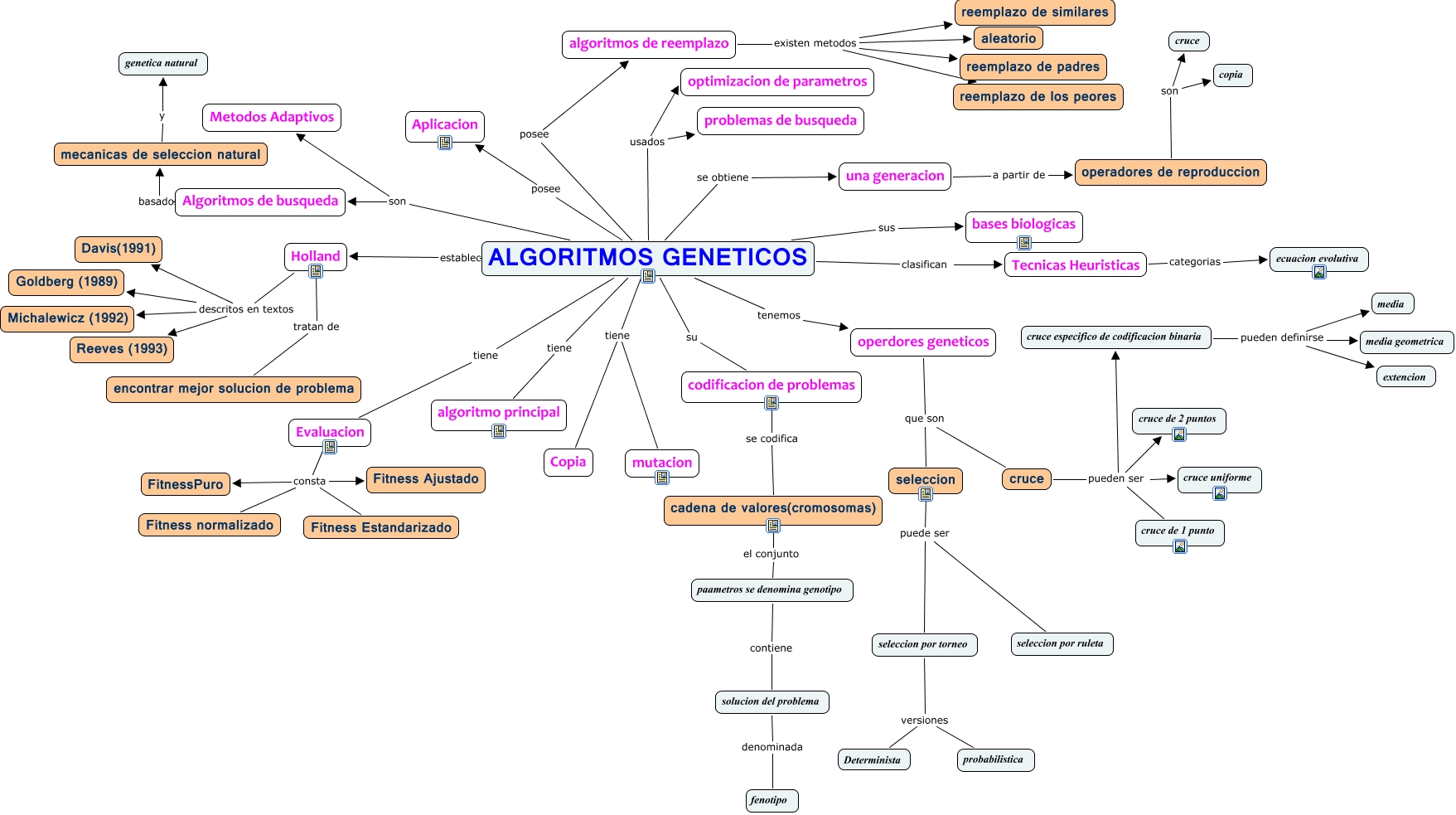 Este Cmap, tiene información relacionada con: mapa algoritmos geneticos.cmap, operdores geneticos que son cruce, ALGORITMOS GENETICOS sus bases biologicas, paametros se denomina genotipo contiene solucion del problema, Algoritmos de busqueda basados mecanicas de seleccion natural, seleccion por torneo versiones Determinista, ALGORITMOS GENETICOS se obtiene una generacion, ALGORITMOS GENETICOS tiene Evaluacion, algoritmos de reemplazo existen metodos reemplazo de padres, ALGORITMOS GENETICOS clasifican Tecnicas Heuristicas, operadores de reproduccion son copia, una generacion a partir de operadores de reproduccion, solucion del problema denominada fenotipo, ALGORITMOS GENETICOS tiene algoritmo principal, ALGORITMOS GENETICOS su codificacion de problemas, cruce pueden ser cruce especifico de codificacion binaria, seleccion puede ser seleccion por torneo, ALGORITMOS GENETICOS tenemos operdores geneticos, cruce especifico de codificacion binaria pueden definirse media, seleccion por torneo versiones probabilistica, cruce pueden ser cruce uniforme