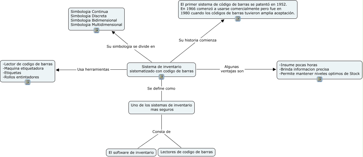 Este Cmap, tiene información relacionada con: MIS + Codigo de barras, Sistema de inventario sistematizado con codigo de barras Su simbologia se divide en Simbologia Continua Simbologia Discreta Simbologia Bidimensional Simbologia Multidimensional, Sistema de inventario sistematizado con codigo de barras Usa herramientas -Lector de codigo de barras -Maquina etiquetadora -Etiquetas -Rollos entintadores, Sistema de inventario sistematizado con codigo de barras Su historia comienza El primer sistema de código de barras se patentó en 1952. En 1966 comenzó a usarse comercialmente pero fue en 1980 cuando los códigos de barras tuvieron amplia aceptación., Uno de los sistemas de inventario mas seguros Consta de Lectores de codigo de barras, Sistema de inventario sistematizado con codigo de barras Algunas ventajas son -Insume pocas horas -Brinda informacion precisa -Permite mantener niveles optimos de Stock, Sistema de inventario sistematizado con codigo de barras Se define como Uno de los sistemas de inventario mas seguros, Uno de los sistemas de inventario mas seguros Consta de El software de inventario