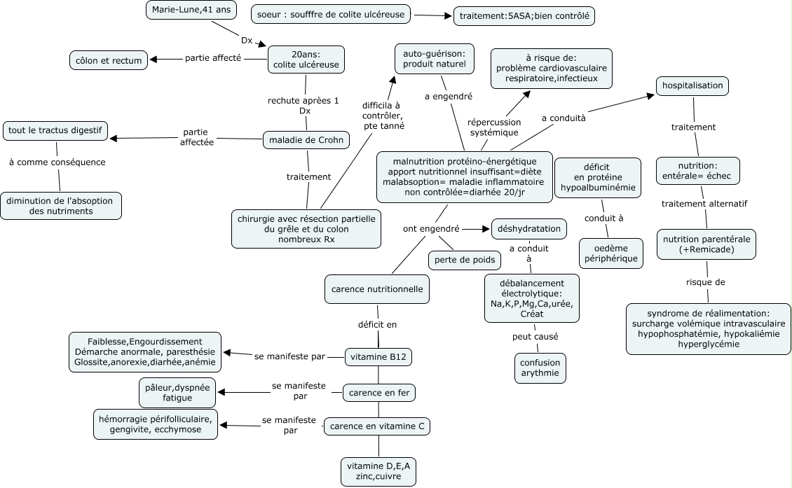 This Concept Map, created with IHMC CmapTools, has information related to: problème 8 groupe 1, carence en vitamine C se manifeste par hémorragie périfolliculaire, gengivite, ecchymose, 20ans: colite ulcéreuse partie affecté côlon et rectum, malnutrition protéino-énergétique apport nutritionnel insuffisant=diète malabsoption= maladie inflammatoire non contrôlée=diarhée 20/jr ont engendré carence nutritionnelle, déficit en protéine hypoalbuminémie conduit à oedème périphérique, vitamine B12 se manifeste par Faiblesse,Engourdissement Démarche anormale, paresthésie Glossite,anorexie,diarhée,anémie, Marie-Lune,41 ans Dx 20ans: colite ulcéreuse, auto-guérison: produit naturel a engendré malnutrition protéino-énergétique apport nutritionnel insuffisant=diète malabsoption= maladie inflammatoire non contrôlée=diarhée 20/jr, débalancement électrolytique: Na,K,P,Mg,Ca,urée, Créat peut causé confusion arythmie, nutrition: entérale= échec traitement alternatif nutrition parentérale (+Remicade), malnutrition protéino-énergétique apport nutritionnel insuffisant=diète malabsoption= maladie inflammatoire non contrôlée=diarhée 20/jr dé déficit en protéine hypoalbuminémie, hospitalisation traitement nutrition: entérale= échec, soeur : soufffre de colite ulcéreuse ???? traitement:5ASA;bien contrôlé, 20ans: colite ulcéreuse rechute aprèes 1 Dx maladie de Crohn, carence nutritionnelle déficit en vitamine D,E,A zinc,cuivre, carence nutritionnelle déficit en vitamine B12, carence en fer se manifeste par pâleur,dyspnée fatigue, maladie de Crohn traitement chirurgie avec résection partielle du grêle et du colon nombreux Rx, malnutrition protéino-énergétique apport nutritionnel insuffisant=diète malabsoption= maladie inflammatoire non contrôlée=diarhée 20/jr a conduità hospitalisation, malnutrition protéino-énergétique apport nutritionnel insuffisant=diète malabsoption= maladie inflammatoire non contrôlée=diarhée 20/jr ont engendré perte de poids, nutrition parentérale (+Remicade) risque de syndrome de réalimentation: surcharge volémique intravasculaire hypophosphatémie, hypokaliémie hyperglycémie