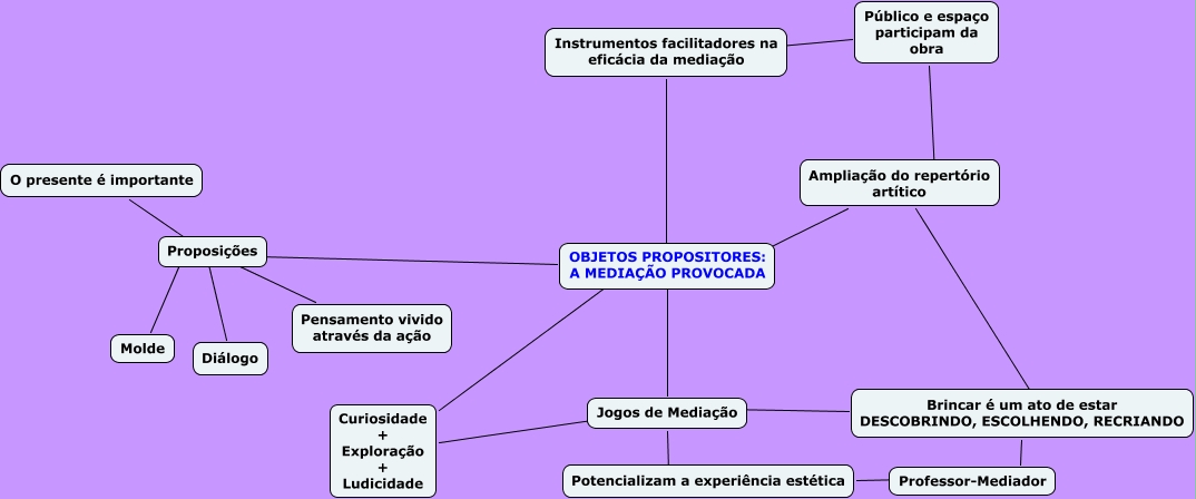 Esse mapa conceitual, produzido no IHMC CmapTools, tem a informação relacionada a: Objetos Propositores, Instrumentos facilitadores na eficácia da mediação ???? OBJETOS PROPOSITORES: A MEDIAÇÃO PROVOCADA, Ampliação do repertório artítico ???? Brincar é um ato de estar DESCOBRINDO, ESCOLHENDO, RECRIANDO, Diálogo ???? Proposições, Jogos de Mediação ???? Potencializam a experiência estética, Pensamento vivido através da ação ???? Proposições, Brincar é um ato de estar DESCOBRINDO, ESCOLHENDO, RECRIANDO ???? Jogos de Mediação, Brincar é um ato de estar DESCOBRINDO, ESCOLHENDO, RECRIANDO ???? Professor-Mediador, Ampliação do repertório artítico ???? OBJETOS PROPOSITORES: A MEDIAÇÃO PROVOCADA, Potencializam a experiência estética ???? Professor-Mediador, Curiosidade + Exploração + Ludicidade ???? OBJETOS PROPOSITORES: A MEDIAÇÃO PROVOCADA, Molde ???? Proposições, Curiosidade + Exploração + Ludicidade ???? Jogos de Mediação, O presente é importante ???? Proposições, OBJETOS PROPOSITORES: A MEDIAÇÃO PROVOCADA ???? Proposições, Público e espaço participam da obra ???? Ampliação do repertório artítico, OBJETOS PROPOSITORES: A MEDIAÇÃO PROVOCADA ???? Jogos de Mediação, Público e espaço participam da obra ???? Instrumentos facilitadores na eficácia da mediação