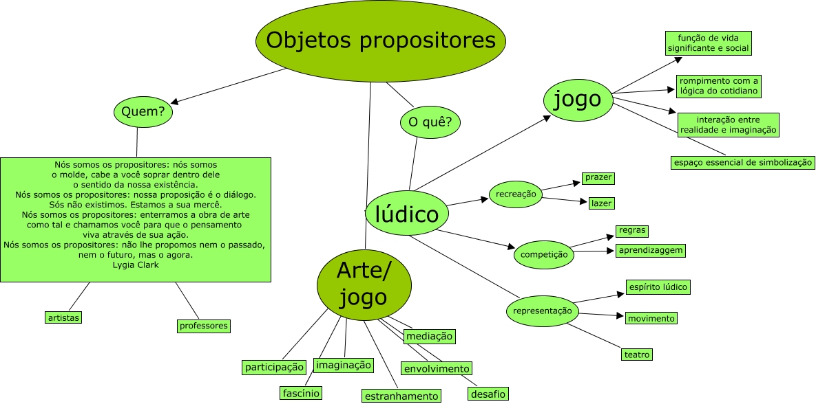 Esse mapa conceitual, produzido no IHMC CmapTools, tem a informação relacionada a: objetos propositores, Arte/ jogo ???? mediação, lúdico ???? recreação, jogo ???? espaço essencial de simbolização, lúdico ???? jogo, jogo ???? rompimento com a lógica do cotidiano, Arte/ jogo ???? estranhamento, representação ???? espírito lúdico, Arte/ jogo ???? fascínio, Objetos propositores ???? Quem?, O quê? ???? lúdico, Arte/ jogo ???? envolvimento, Nós somos os propositores: nós somos o molde, cabe a você soprar dentro dele o sentido da nossa existência. Nós somos os propositores: nossa proposição é o diálogo. Sós não existimos. Estamos a sua mercê. Nós somos os propositores: enterramos a obra de arte como tal e chamamos você para que o pensamento viva através de sua ação. Nós somos os propositores: não lhe propomos nem o passado, nem o futuro, mas o agora. Lygia Clark ???? artistas, Quem? ???? Nós somos os propositores: nós somos o molde, cabe a você soprar dentro dele o sentido da nossa existência. Nós somos os propositores: nossa proposição é o diálogo. Sós não existimos. Estamos a sua mercê. Nós somos os propositores: enterramos a obra de arte como tal e chamamos você para que o pensamento viva através de sua ação. Nós somos os propositores: não lhe propomos nem o passado, nem o futuro, mas o agora. Lygia Clark, representação ???? movimento, recreação ???? prazer, Objetos propositores ???? O quê?, Arte/ jogo ???? desafio, jogo ???? função de vida significante e social, recreação ???? lazer, Arte/ jogo ???? imaginação