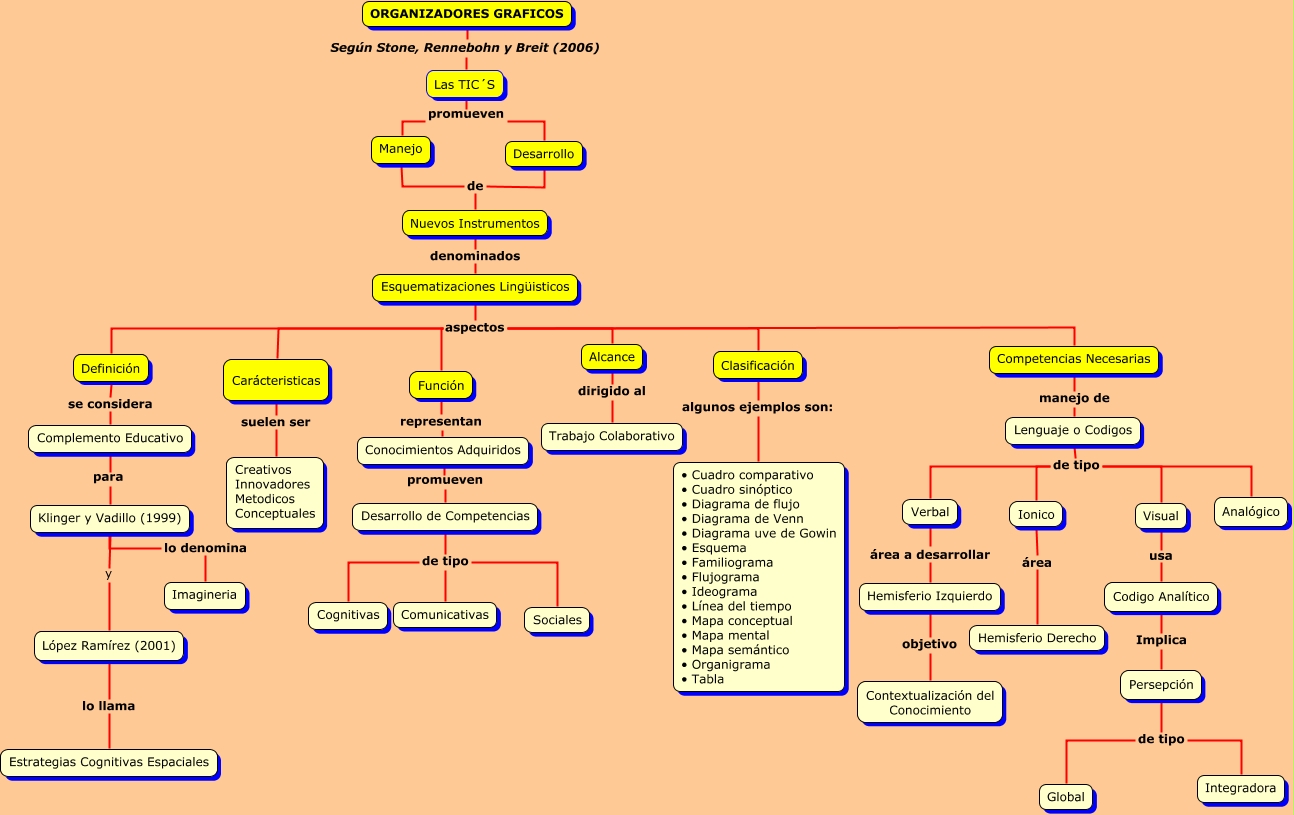 Este Cmap, tiene información relacionada con: Organizadores Graficos, ORGANIZADORES GRAFICOS Según Stone, Rennebohn y Breit (2006) Las TIC´S, Esquematizaciones Lingüisticos aspectos Función, Lenguaje o Codigos de tipo Analógico, Klinger y Vadillo (1999) lo denomina Imagineria, Clasificación algunos ejemplos son: • Cuadro comparativo • Cuadro sinóptico • Diagrama de flujo • Diagrama de Venn • Diagrama uve de Gowin • Esquema • Familiograma • Flujograma • Ideograma • Línea del tiempo • Mapa conceptual • Mapa mental • Mapa semántico • Organigrama • Tabla, Esquematizaciones Lingüisticos aspectos Competencias Necesarias, Visual usa Codigo Analítico, Manejo de Nuevos Instrumentos, Lenguaje o Codigos de tipo Verbal, Desarrollo de Nuevos Instrumentos, Desarrollo de Competencias de tipo Sociales, Esquematizaciones Lingüisticos aspectos Clasificación, Hemisferio Izquierdo objetivo Contextualización del Conocimiento, Las TIC´S promueven Desarrollo, Esquematizaciones Lingüisticos aspectos Definición, Persepción de tipo Integradora, Lenguaje o Codigos de tipo Visual, Competencias Necesarias manejo de Lenguaje o Codigos, Alcance dirigido al Trabajo Colaborativo, Esquematizaciones Lingüisticos aspectos Carácteristicas