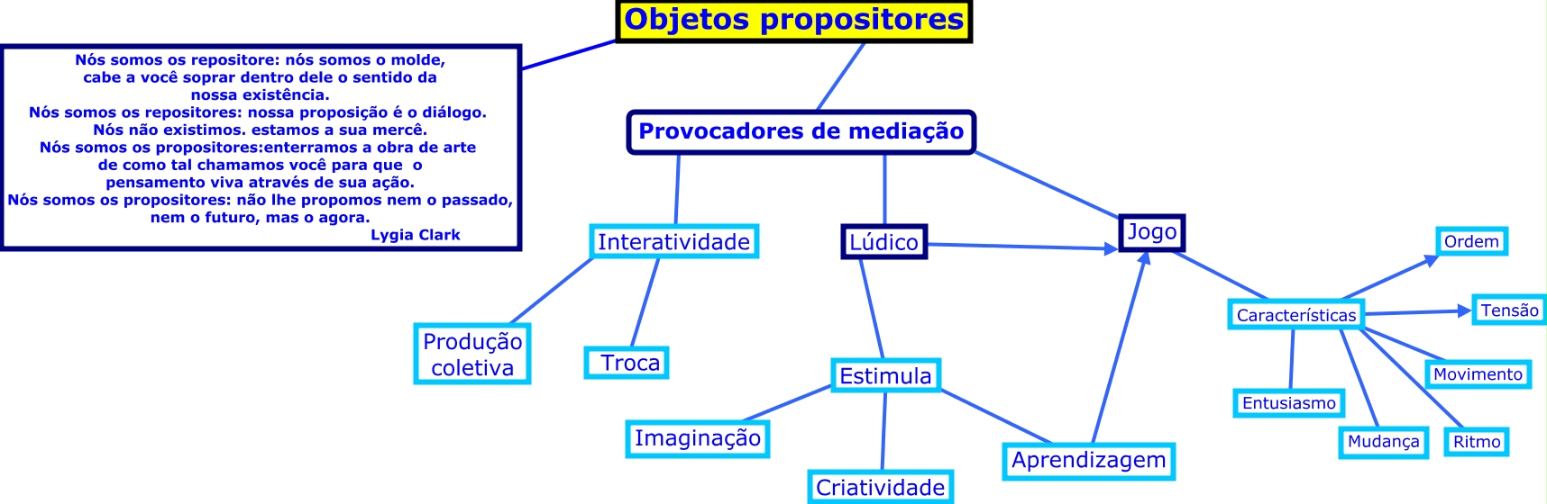 Esse mapa conceitual, produzido no IHMC CmapTools, tem a informação relacionada a: Objetos propositores, Características ???? Ritmo, Características ???? Movimento, Estimula ???? Aprendizagem, Características ???? Entusiasmo, Provocadores de mediação ???? Interatividade, Estimula ???? Criatividade, Interatividade ???? Troca, Interatividade ???? Produção coletiva, Provocadores de mediação ???? Jogo, Aprendizagem ???? ????, Estimula ???? Imaginação, Objetos propositores ???? Nós somos os repositore: nós somos o molde, cabe a você soprar dentro dele o sentido da nossa existência. Nós somos os repositores: nossa proposição é o diálogo. Nós não existimos. estamos a sua mercê. Nós somos os propositores:enterramos a obra de arte de como tal chamamos você para que o pensamento viva através de sua ação. Nós somos os propositores: não lhe propomos nem o passado, nem o futuro, mas o agora. Lygia Clark, Características ???? Tensão, Jogo ???? Características, Provocadores de mediação ???? Lúdico, Lúdico ???? Jogo, Características ???? Ordem, Lúdico E Estimula, Objetos propositores ???? Provocadores de mediação, Características ???? Mudança