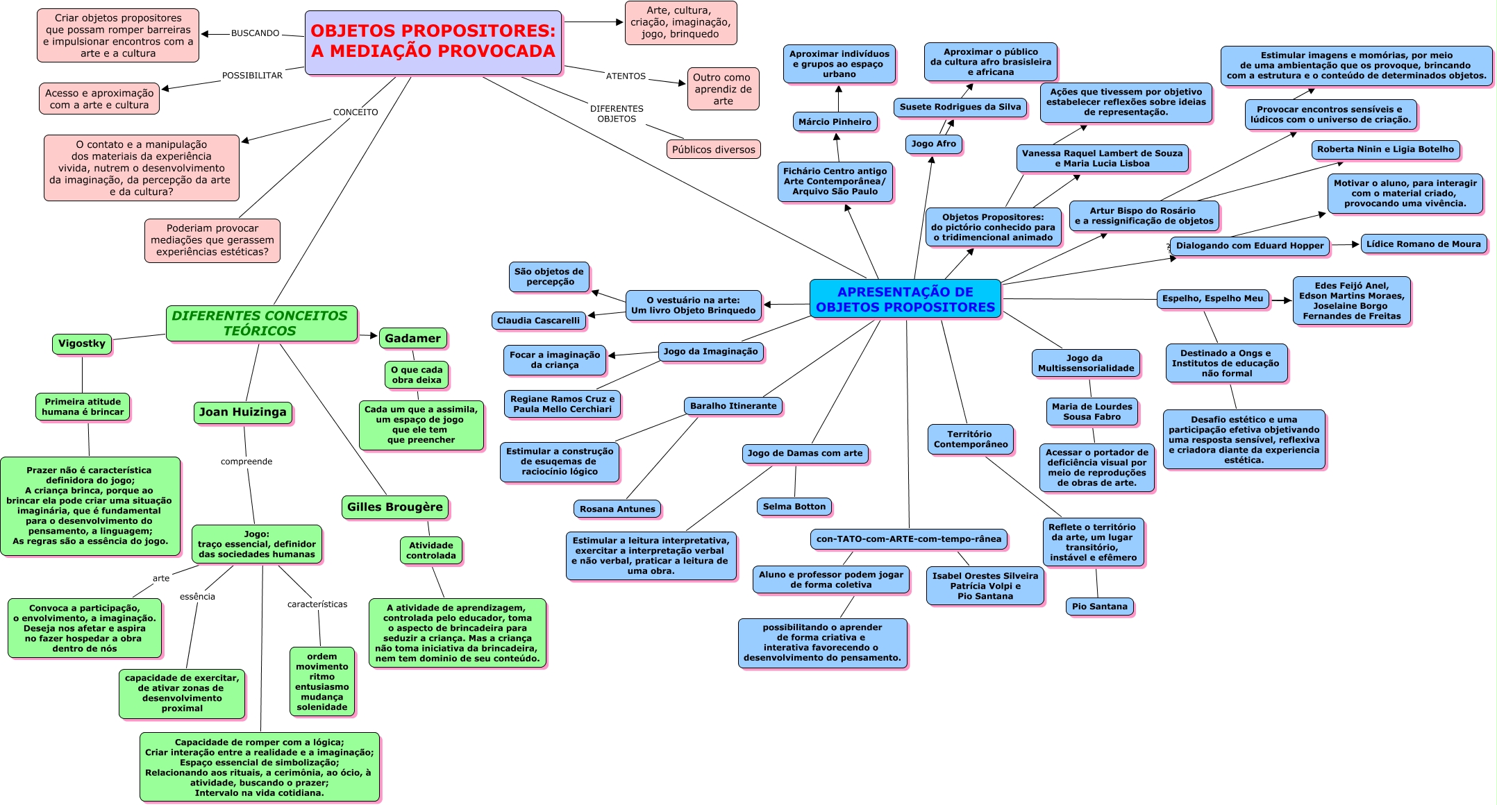 Esse mapa conceitual, produzido no IHMC CmapTools, tem a informação relacionada a: objetos propositores, Jogo da Multissensorialidade ???? Maria de Lourdes Sousa Fabro, APRESENTAÇÃO DE OBJETOS PROPOSITORES Espelho, Espelho Meu, con-TATO-com-ARTE-com-tempo-rânea ???? Aluno e professor podem jogar de forma coletiva, APRESENTAÇÃO DE OBJETOS PROPOSITORES ???? Dialogando com Eduard Hopper, APRESENTAÇÃO DE OBJETOS PROPOSITORES ???? Baralho Itinerante, Edes Feijó Anel, Edson Martins Moraes, Joselaine Borgo Fernandes de Freitas ???? Destinado a Ongs e Institutos de educação não formal, DIFERENTES CONCEITOS TEÓRICOS ???? Gadamer, Aluno e professor podem jogar de forma coletiva ???? possibilitando o aprender de forma criativa e interativa favorecendo o desenvolvimento do pensamento., Jogo da Imaginação ???? Focar a imaginação da criança, Espelho, Espelho Meu ???? Edes Feijó Anel, Edson Martins Moraes, Joselaine Borgo Fernandes de Freitas, Gadamer ???? O que cada obra deixa, OBJETOS PROPOSITORES: A MEDIAÇÃO PROVOCADA DIFERENTES OBJETOS Públicos diversos, DIFERENTES CONCEITOS TEÓRICOS ???? Gilles Brougère, DIFERENTES CONCEITOS TEÓRICOS ???? Vigostky, Jogo de Damas com arte ???? Estimular a leitura interpretativa, exercitar a interpretação verbal e não verbal, praticar a leitura de uma obra., Joan Huizinga compreende Jogo: traço essencial, definidor das sociedades humanas, Fichário Centro antigo Arte Contemporânea/ Arquivo São Paulo ???? Márcio Pinheiro, OBJETOS PROPOSITORES: A MEDIAÇÃO PROVOCADA ???? Arte, cultura, criação, imaginação, jogo, brinquedo, Gilles Brougère ???? Atividade controlada, Jogo: traço essencial, definidor das sociedades humanas essência capacidade de exercitar, de ativar zonas de desenvolvimento proximal