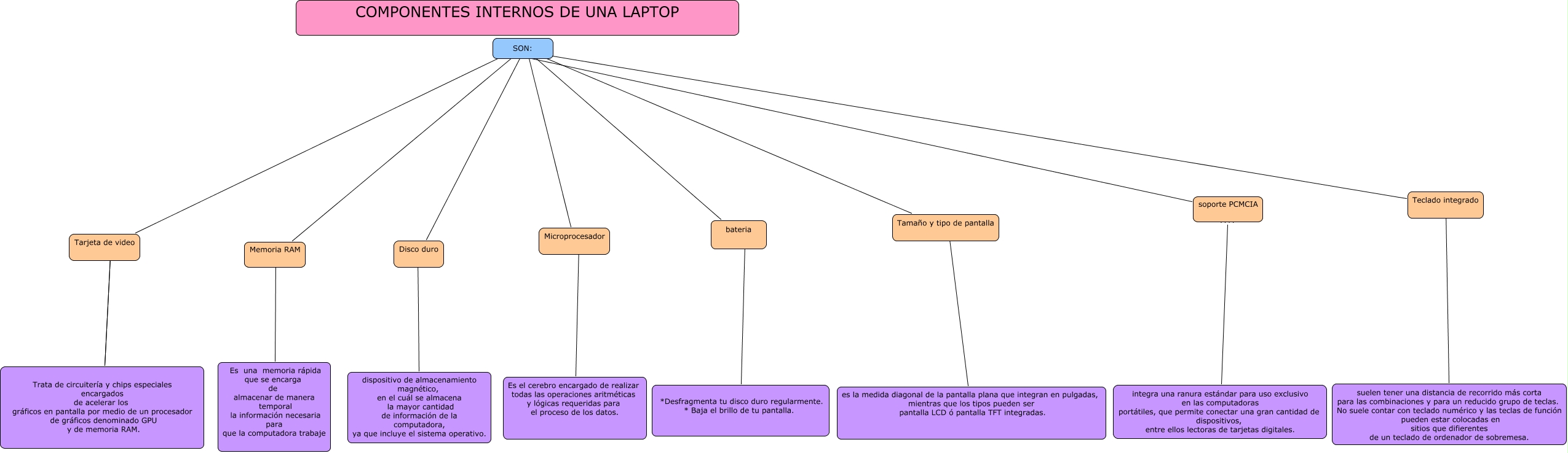 Este Cmap, tiene información relacionada con: componentes de una laptop, integra una ranura estándar para uso exclusivo en las computadoras portátiles, que permite conectar una gran cantidad de dispositivos, entre ellos lectoras de tarjetas digitales. ???? soporte PCMCIA, es la medida diagonal de la pantalla plana que integran en pulgadas, mientras que los tipos pueden ser pantalla LCD ó pantalla TFT integradas. ???? Tamaño y tipo de pantalla, Trata de circuitería y chips especiales encargados de acelerar los gráficos en pantalla por medio de un procesador de gráficos denominado GPU y de memoria RAM. ???? Tarjeta de video, dispositivo de almacenamiento magnético, en el cuál se almacena la mayor cantidad de información de la computadora, ya que incluye el sistema operativo. ???? Disco duro, Microprocesador ???? Disco duro, * Desfragmenta tu disco duro regularmente. * Baja el brillo de tu pantalla. ???? bateria, Es una memoria rápida que se encarga de almacenar de manera temporal la información necesaria para que la computadora trabaje ???? Memoria RAM, Tamaño y tipo de pantalla ???? SON:, Tarjeta de video ???? SON:, Memoria RAM ???? Disco duro, Es el cerebro encargado de realizar todas las operaciones aritméticas y lógicas requeridas para el proceso de los datos. ???? Microprocesador, Es el cerebro encargado de realizar todas las operaciones aritméticas y lógicas requeridas para el proceso de los datos. ???? Microprocesador, bateria ???? Disco duro, Teclado integrado ???? SON:, Trata de circuitería y chips especiales encargados de acelerar los gráficos en pantalla por medio de un procesador de gráficos denominado GPU y de memoria RAM. ???? Tarjeta de video, soporte PCMCIA ???? SON:, suelen tener una distancia de recorrido más corta para las combinaciones y para un reducido grupo de teclas. No suele contar con teclado numérico y las teclas de función pueden estar colocadas en sitios que difierentes de un teclado de ordenador de sobremesa. ???? Teclado integrado