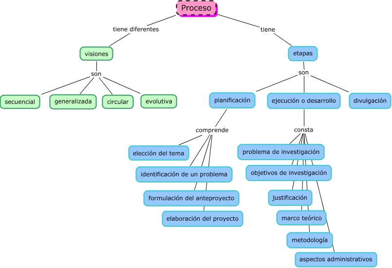 Este Cmap, tiene información relacionada con: Proceso, etapas son divulgación, ejecución o desarrollo consta metodología, planificación comprende elaboración del proyecto, etapas son ejecución o desarrollo, ejecución o desarrollo consta justificación, visiones son generalizada, planificación comprende formulación del anteproyecto, Proceso tiene diferentes visiones, ejecución o desarrollo consta problema de investigación, ejecución o desarrollo consta objetivos de investigación, visiones son secuencial, visiones son evolutiva, visiones son circular, etapas son planificación, Proceso tiene etapas, planificación comprende identificación de un problema, planificación comprende elección del tema, ejecución o desarrollo consta aspectos administrativos, ejecución o desarrollo consta marco teórico