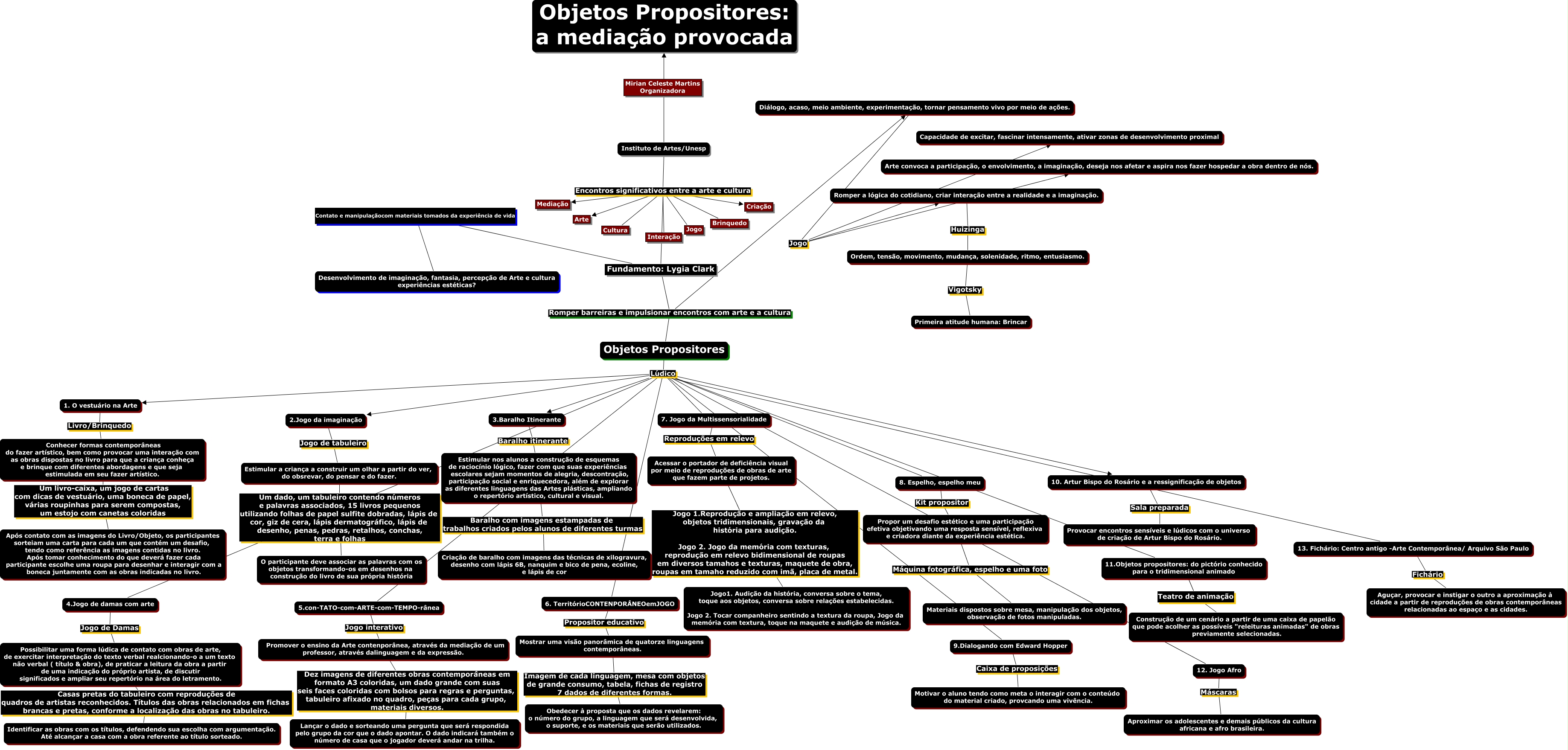 Esse mapa conceitual, produzido no IHMC CmapTools, tem a informação relacionada a: Objetos Propositores, Instituto de Artes/Unesp Encontros significativos entre a arte e cultura Arte, Estimular a criança a construir um olhar a partir do ver, do obsrevar, do pensar e do fazer. Um dado, um tabuleiro contendo números e palavras associados, 15 livros pequenos utilizando folhas de papel sulfite dobradas, lápis de cor, giz de cera, lápis dermatográfico, lápis de desenho, penas, pedras, retalhos, conchas, terra e folhas O participante deve associar as palavras com os objetos transformando-os em desenhos na construção do livro de sua própria história, Objetos Propositores Lúdico 11.Objetos propositores: do pictório conhecido para o tridimensional animado, 8. Espelho, espelho meu Kit propositor Propor um desafio estético e uma participação efetiva objetivando uma resposta sensível, reflexiva e criadora diante da experiência estética., Objetos Propositores Lúdico 6. TerritórioCONTENPORÂNEOemJOGO, Objetos Propositores Lúdico 12. Jogo Afro, Instituto de Artes/Unesp Encontros significativos entre a arte e cultura Cultura, Objetos Propositores Lúdico 2.Jogo da imaginação, Objetos Propositores Lúdico 9.Dialogando com Edward Hopper, 11.Objetos propositores: do pictório conhecido para o tridimensional animado Teatro de animação Construção de um cenário a partir de uma caixa de papelão que pode acolher as possíveis "releituras animadas" de obras previamente selecionadas., Diálogo, acaso, meio ambiente, experimentação, tornar pensamento vivo por meio de ações. Jogo Capacidade de excitar, fascinar intensamente, ativar zonas de desenvolvimento proximal, Objetos Propositores Lúdico 4.Jogo de damas com arte, 13. Fichário: Centro antigo -Arte Contemporânea/ Arquivo São Paulo Lúdico 7. Jogo da Multissensorialidade, 6. TerritórioCONTENPORÂNEOemJOGO Propositor educativo Mostrar uma visão panorâmica de quatorze linguagens contemporâneas., Instituto de Artes/Unesp Encontros significativos entre a arte e cultura Mediação, Objetos Propositores Lúdico 7. Jogo da Multissensorialidade, 13. Fichário: Centro antigo -Arte Contemporânea/ Arquivo São Paulo Lúdico 5.con-TATO-com-ARTE-com-TEMPO-rânea, Diálogo, acaso, meio ambiente, experimentação, tornar pensamento vivo por meio de ações. Jogo Romper a lógica do cotidiano, criar interação entre a realidade e a imaginação., 13. Fichário: Centro antigo -Arte Contemporânea/ Arquivo São Paulo Lúdico 4.Jogo de damas com arte, Objetos Propositores Lúdico 3.Baralho Itinerante