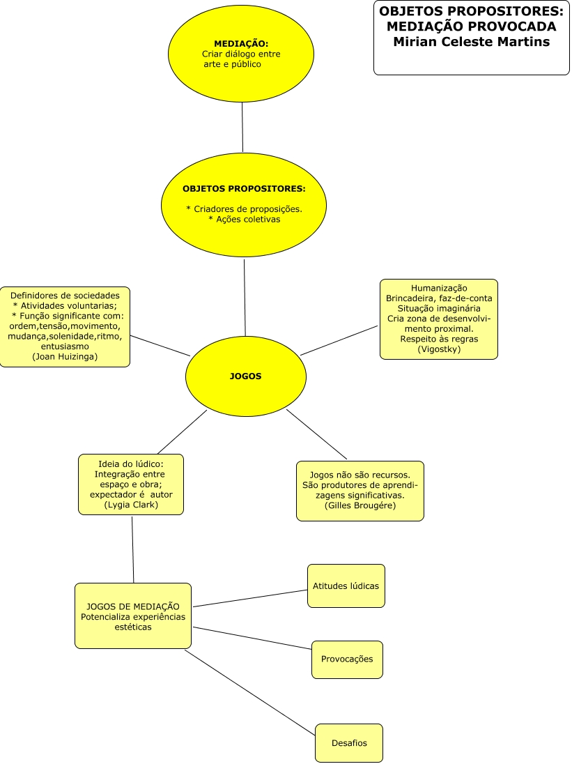 Esse mapa conceitual, produzido no IHMC CmapTools, tem a informação relacionada a: OBJETOS PROPOOOSITORES-MEIAÇAO PROVOCADA, JOGOS ???? Humanização Brincadeira, faz-de-conta Situação imaginária Cria zona de desenvolvi- mento proximal. Respeito às regras (Vigostky), JOGOS DE MEDIAÇÃO Potencializa experiências estéticas ???? Provocações, JOGOS ???? Ideia do lúdico: Integração entre espaço e obra; expectador é autor (Lygia Clark), JOGOS DE MEDIAÇÃO Potencializa experiências estéticas ???? Atitudes lúdicas, Ideia do lúdico: Integração entre espaço e obra; expectador é autor (Lygia Clark) ???? JOGOS DE MEDIAÇÃO Potencializa experiências estéticas, OBJETOS PROPOSITORES: * Criadores de proposições. * Ações coletivas ???? JOGOS, MEDIAÇÃO: Criar diálogo entre arte e público ???? OBJETOS PROPOSITORES: * Criadores de proposições. * Ações coletivas, JOGOS DE MEDIAÇÃO Potencializa experiências estéticas ???? Desafios, JOGOS ???? Jogos não são recursos. São produtores de aprendi- zagens significativas. (Gilles Brougére), JOGOS ???? Definidores de sociedades * Atividades voluntarias; * Função significante com: ordem,tensão,movimento, mudança,solenidade,ritmo, entusiasmo (Joan Huizinga)