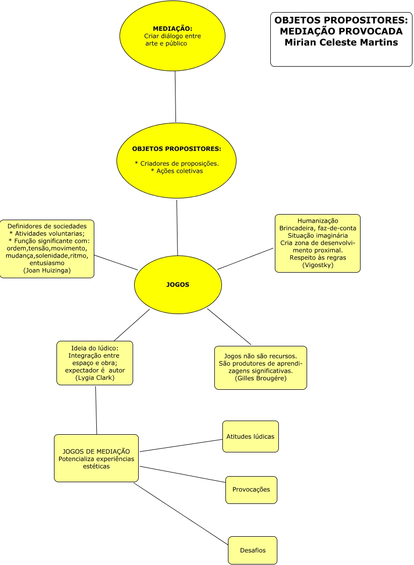 Esse mapa conceitual, produzido no IHMC CmapTools, tem a informação relacionada a: OBJETOS PROPOSITORES-MEIAÇAO PROVOCADA, JOGOS ???? Humanização Brincadeira, faz-de-conta Situação imaginária Cria zona de desenvolvi- mento proximal. Respeito às regras (Vigostky), JOGOS DE MEDIAÇÃO Potencializa experiências estéticas ???? Provocações, JOGOS ???? Ideia do lúdico: Integração entre espaço e obra; expectador é autor (Lygia Clark), JOGOS DE MEDIAÇÃO Potencializa experiências estéticas ???? Atitudes lúdicas, Ideia do lúdico: Integração entre espaço e obra; expectador é autor (Lygia Clark) ???? JOGOS DE MEDIAÇÃO Potencializa experiências estéticas, OBJETOS PROPOSITORES: * Criadores de proposições. * Ações coletivas ???? JOGOS, MEDIAÇÃO: Criar diálogo entre arte e público ???? OBJETOS PROPOSITORES: * Criadores de proposições. * Ações coletivas, JOGOS DE MEDIAÇÃO Potencializa experiências estéticas ???? Desafios, JOGOS ???? Jogos não são recursos. São produtores de aprendi- zagens significativas. (Gilles Brougére), JOGOS ???? Definidores de sociedades * Atividades voluntarias; * Função significante com: ordem,tensão,movimento, mudança,solenidade,ritmo, entusiasmo (Joan Huizinga)