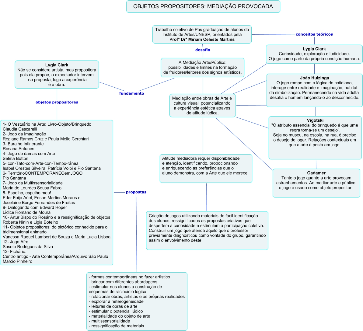 Esse mapa conceitual, produzido no IHMC CmapTools, tem a informação relacionada a: Objetos Propositores.jpeg, A Mediação Arte/Público: possibilidades e limites na formação de fruidores/leitores dos signos artísticos. fundamento ????, Vigotski "O atributo essencial do brinquedo é que uma regra torna-se um desejo". Seja no museu, na escola, na rua, é preciso o desejo de jogar. Relações contextuais em que a arte é posta em jogo. ???? Gadamer Tanto o jogo quanto a arte provocam estranhamentos. Ao mediar arte e público, o jogo é usado como objeto propositor., Mediação entre obras de Arte e cultura visual, potencializando a experiência estética através de atitude lúdica. ???? João Huizinga O jogo rompe com a lógica do cotidiano, interage entre realidade e imaginação, habitat da simbolização. Permanecendo na vida adulta desafia o homem lançando-o ao desconhecido., Vigotski "O atributo essencial do brinquedo é que uma regra torna-se um desejo". Seja no museu, na escola, na rua, é preciso o desejo de jogar. Relações contextuais em que a arte é posta em jogo. ???? João Huizinga O jogo rompe com a lógica do cotidiano, interage entre realidade e imaginação, habitat da simbolização. Permanecendo na vida adulta desafia o homem lançando-o ao desconhecido., Mediação entre obras de Arte e cultura visual, potencializando a experiência estética através de atitude lúdica. ???? Atitude mediadora requer disponibilidade e atenção, identificando, propocionando e enriquecendo as preferências que o aluno demonstra, com a Arte que ele merece., Lygia Clark Curiosidade, exploração e ludicidade. O jogo como parte da própria condição humana. ???? João Huizinga O jogo rompe com a lógica do cotidiano, interage entre realidade e imaginação, habitat da simbolização. Permanecendo na vida adulta desafia o homem lançando-o ao desconhecido., Trabalho coletivo de Pós graduação de alunos do Instituto de Artes/UNESP, orientados pela Profª Drª Miriam Celeste Martins conceitos teóricos Lygia Clark Curiosidade, exploração e ludicidade. O jogo como parte da própria condição humana., Mediação entre obras de Arte e cultura visual, potencializando a experiência estética através de atitude lúdica. ???? Lygia Clark Curiosidade, exploração e ludicidade. O jogo como parte da própria condição humana., Mediação entre obras de Arte e cultura visual, potencializando a experiência estética através de atitude lúdica. ???? Vigotski "O atributo essencial do brinquedo é que uma regra torna-se um desejo". Seja no museu, na escola, na rua, é preciso o desejo de jogar. Relações contextuais em que a arte é posta em jogo., Trabalho coletivo de Pós graduação de alunos do Instituto de Artes/UNESP, orientados pela Profª Drª Miriam Celeste Martins desafio A Mediação Arte/Público: possibilidades e limites na formação de fruidores/leitores dos signos artísticos., Lygia Clark Não se considera artista, mas propositora pois ela propõe, o expectador intervem na proposta, logo a experência é a obra. objetos propositores 1- O Vestuário na Arte: Livro-Objeto/Brinquedo Claudia Cascarelli 2- Jogo da Imaginação Regiane Ramos Cruz e Paula Mello Cerchiari 3- Baralho Intinerante Rosana Antunes 4- Jogo de damas com Arte Selma Botton 5- con-Tato-com-Arte-con-Tempo-rânea Isabel Orestes Silveira, Patrícia Volpi e Pio Santana 6- TerritórioCONTEMPORÂNEOemJOGO Pio Santana 7- Jogo da Multissensorialidade Maria de Lourdes Sousa Fabro 8- Espelho, espelho meu! Eder Feijó Añel, Edson Martins Moraes e Joselaine Borgo Fernandes de Freitas 9- Dialogando com Edward Hoper Lídice Romano de Moura 10- Artur Bispo do Rosário e a ressignificação de objetos Roberta Ninin e Ligia Botelho 11- Objetos propositores: do pictórico conhecido para o tridimensional animado Vanessa Raquel Lambert de Souza e Maria Lucia Lisboa 12- Jogo Afro Susete Rodrigues da Silva 13- Fichário: Centro antigo - Arte Contemporânea/Arquivo São Paulo Marcio Pinheiro, Mediação entre obras de Arte e cultura visual, potencializando a experiência estética através de atitude lúdica. ???? João Huizinga O jogo rompe com a lógica do cotidiano, interage entre realidade e imaginação, habitat da simbolização. Permanecendo na vida adulta desafia o homem lançando-o ao desconhecido., Vigotski "O atributo essencial do brinquedo é que uma regra torna-se um desejo". Seja no museu, na escola, na rua, é preciso o desejo de jogar. Relações contextuais em que a arte é posta em jogo. ???? João Huizinga O jogo rompe com a lógica do cotidiano, interage entre realidade e imaginação, habitat da simbolização. Permanecendo na vida adulta desafia o homem lançando-o ao desconhecido., Mediação entre obras de Arte e cultura visual, potencializando a experiência estética através de atitude lúdica. ???? Gadamer Tanto o jogo quanto a arte provocam estranhamentos. Ao mediar arte e público, o jogo é usado como objeto propositor., 1- O Vestuário na Arte: Livro-Objeto/Brinquedo Claudia Cascarelli 2- Jogo da Imaginação Regiane Ramos Cruz e Paula Mello Cerchiari 3- Baralho Intinerante Rosana Antunes 4- Jogo de damas com Arte Selma Botton 5- con-Tato-com-Arte-con-Tempo-rânea Isabel Orestes Silveira, Patrícia Volpi e Pio Santana 6- TerritórioCONTEMPORÂNEOemJOGO Pio Santana 7- Jogo da Multissensorialidade Maria de Lourdes Sousa Fabro 8- Espelho, espelho meu! Eder Feijó Añel, Edson Martins Moraes e Joselaine Borgo Fernandes de Freitas 9- Dialogando com Edward Hoper Lídice Romano de Moura 10- Artur Bispo do Rosário e a ressignificação de objetos Roberta Ninin e Ligia Botelho 11- Objetos propositores: do pictórico conhecido para o tridimensional animado Vanessa Raquel Lambert de Souza e Maria Lucia Lisboa 12- Jogo Afro Susete Rodrigues da Silva 13- Fichário: Centro antigo - Arte Contemporânea/Arquivo São Paulo Marcio Pinheiro propostas - formas contemporâneas no fazer artístico - brincar com dif