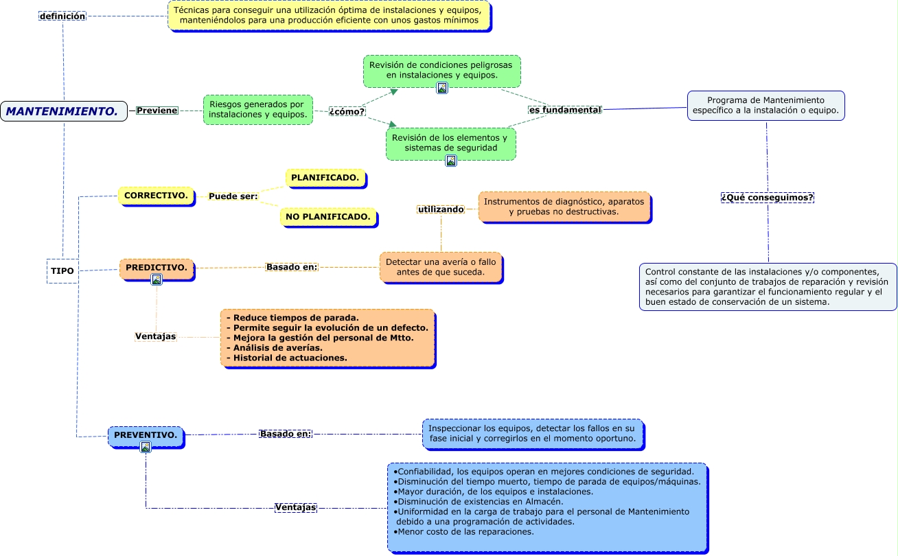 Este Cmap, tiene información relacionada con: PLAN DE MANTENIMIENTO, CORRECTIVO. Puede ser: PLANIFICADO., PREVENTIVO. Basado en: Inspeccionar los equipos, detectar los fallos en su fase inicial y corregirlos en el momento oportuno., MANTENIMIENTO. TIPO PREVENTIVO., Riesgos generados por instalaciones y equipos. ¿cómo? Revisión de los elementos y sistemas de seguridad, CORRECTIVO. Puede ser: NO PLANIFICADO., MANTENIMIENTO. TIPO CORRECTIVO., Revisión de condiciones peligrosas en instalaciones y equipos. es fundamental Programa de Mantenimiento específico a la instalación o equipo., Detectar una avería o fallo antes de que suceda. utilizando Instrumentos de diagnóstico, aparatos y pruebas no destructivas., Riesgos generados por instalaciones y equipos. ¿cómo? Revisión de condiciones peligrosas en instalaciones y equipos., MANTENIMIENTO. Previene Riesgos generados por instalaciones y equipos., Revisión de los elementos y sistemas de seguridad es fundamental Programa de Mantenimiento específico a la instalación o equipo., MANTENIMIENTO. TIPO PREDICTIVO., - Reduce tiempos de parada. - Permite seguir la evolución de un defecto. - Mejora la gestión del personal de Mtto. - Análisis de averías. - Historial de actuaciones. Ventajas PREDICTIVO., PREDICTIVO. Basado en: Detectar una avería o fallo antes de que suceda., Programa de Mantenimiento específico a la instalación o equipo. ¿Qué conseguimos? Control constante de las instalaciones y/o componentes, así como del conjunto de trabajos de reparación y revisión necesarios para garantizar el funcionamiento regular y el buen estado de conservación de un sistema., MANTENIMIENTO. definición Técnicas para conseguir una utilización óptima de instalaciones y equipos, manteniéndolos para una producción eficiente con unos gastos mínimos, PREVENTIVO. Ventajas • Confiabilidad, los equipos operan en mejores condiciones de seguridad. • Disminución del tiempo muerto, tiempo de parada de equipos/máquinas. • Mayor duración, de los equipos e instalaciones. • Disminución de existencias en Almacén. • Uniformidad en la carga de trabajo para el personal de Mantenimiento debido a una programación de actividades. • Menor costo de las reparaciones.