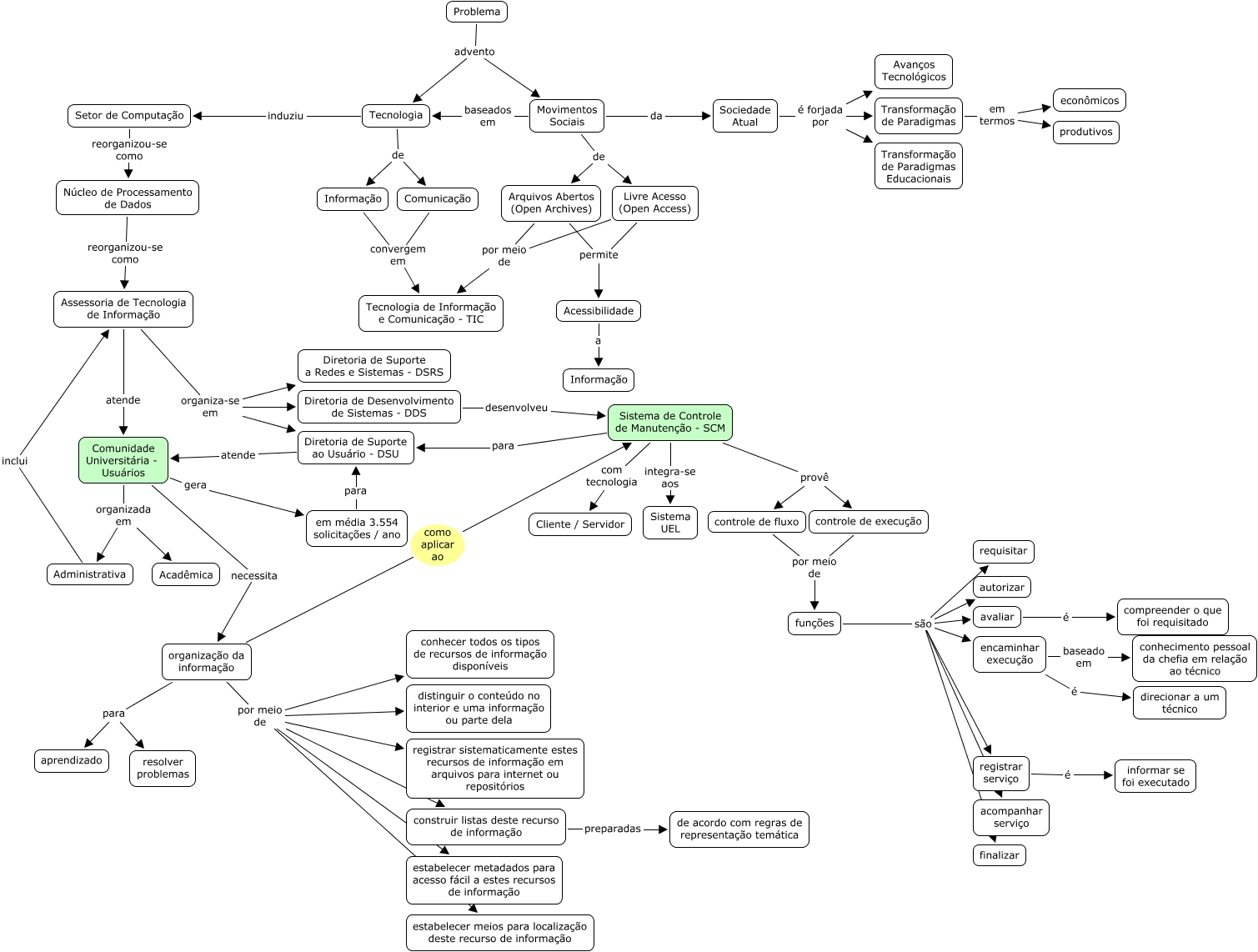 Esse mapa conceitual, produzido no IHMC CmapTools, tem a informação relacionada a: Problematização, organização da informação para resolver problemas, Comunidade Universitária - Usuários gera em média 3.554 solicitações / ano, Movimentos Sociais de Livre Acesso (Open Access), controle de execução por meio de funções, funções são registrar serviço, Comunidade Universitária - Usuários organizada em Administrativa, Acessibilidade a Informação, Sistema de Controle de Manutenção - SCM provê controle de execução, Núcleo de Processamento de Dados reorganizou-se como Assessoria de Tecnologia de Informação, funções são acompanhar serviço, Assessoria de Tecnologia de Informação organiza-se em Diretoria de Suporte a Redes e Sistemas - DSRS, funções são finalizar, organização da informação por meio de conhecer todos os tipos de recursos de informação disponíveis, Movimentos Sociais baseados em Tecnologia, Sistema de Controle de Manutenção - SCM provê controle de fluxo, Movimentos Sociais da Sociedade Atual, Sociedade Atual é forjada por Avanços Tecnológicos, Sistema de Controle de Manutenção - SCM com tecnologia Cliente / Servidor, registrar serviço é informar se foi executado, organização da informação como aplicar ao Sistema de Controle de Manutenção - SCM