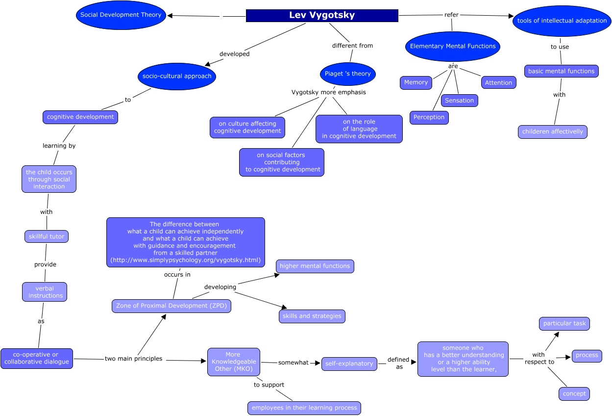 This Concept Map, created with IHMC CmapTools, has information related to: Vygotsky revised 2, Piaget 's theory Vygotsky more emphasis on social factors contributing to cognitive development, the child occurs through social interaction with skillful tutor, tools of intellectual adaptation to use basic mental functions, socio-cultural approach to cognitive development, co-operative or collaborative dialogue two main principles More Knowledgeable Other (MKO), Zone of Proximal Development (ZPD) developing skills and strategies, someone who has a better understanding or a higher ability level than the learner, with respect to concept, Lev Vygotsky developed socio-cultural approach, cognitive development learning by the child occurs through social interaction, Lev Vygotsky refer tools of intellectual adaptation, someone who has a better understanding or a higher ability level than the learner, with respect to process, Zone of Proximal Development (ZPD) developing higher mental functions, skillful tutor provide verbal instructions, Elementary Mental Functions are Attention, Elementary Mental Functions are Memory, More Knowledgeable Other (MKO) somewhat self-explanatory, basic mental functions with childeren affectivelly, someone who has a better understanding or a higher ability level than the learner, with respect to particular task, verbal instructions as co-operative or collaborative dialogue, Zone of Proximal Development (ZPD) occurs in The difference between what a child can achieve independently and what a child can achieve with guidance and encouragement from a skilled partner (http://www.simplypsychology.org/vygotsky.html)