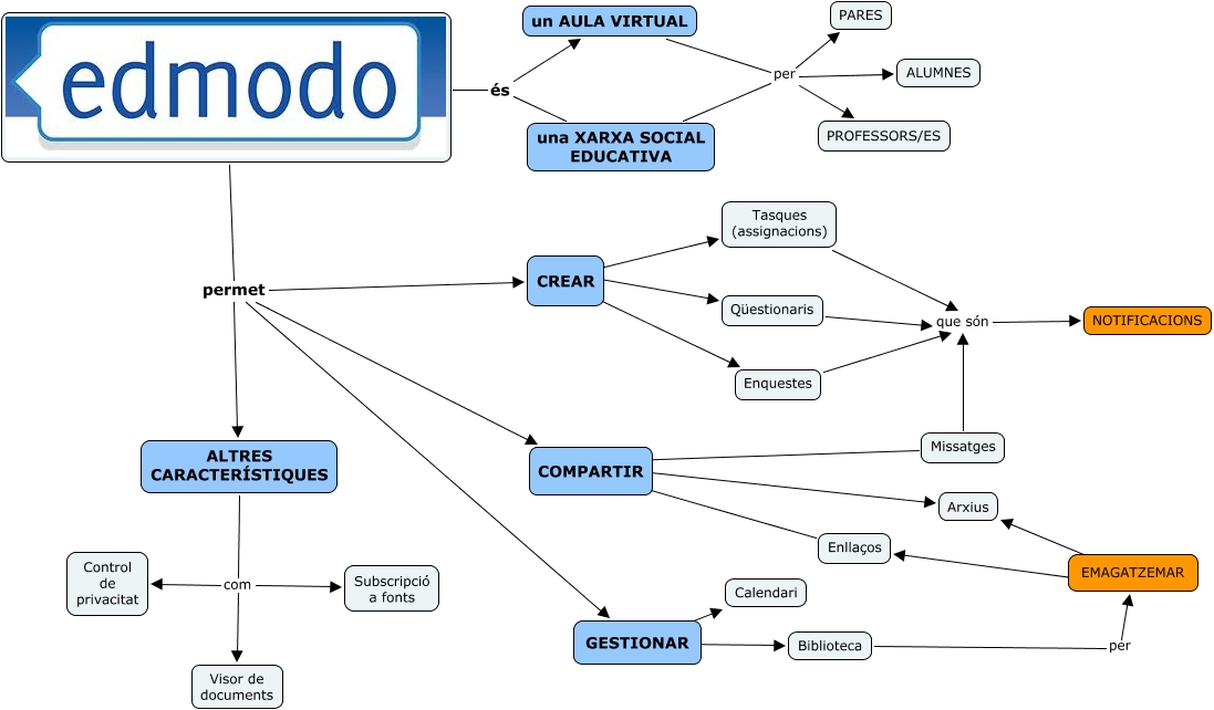 Este Cmap, tiene información relacionada con: EDMODO, GESTIONAR ???? Calendari, és un AULA VIRTUAL, Missatges que són NOTIFICACIONS, CREAR ???? Enquestes, Enllaços ???? COMPARTIR, GESTIONAR ???? Biblioteca, Qüestionaris que són NOTIFICACIONS, ALTRES CARACTERÍSTIQUES com Visor de documents, COMPARTIR ???? Arxius, ALTRES CARACTERÍSTIQUES com Subscripció a fonts, permet CREAR, ALTRES CARACTERÍSTIQUES com Control de privacitat, un AULA VIRTUAL per PARES, EMAGATZEMAR ???? Arxius, un AULA VIRTUAL per PROFESSORS/ES, Enquestes que són NOTIFICACIONS, un AULA VIRTUAL per una XARXA SOCIAL EDUCATIVA, permet ALTRES CARACTERÍSTIQUES, permet COMPARTIR, un AULA VIRTUAL per ALUMNES