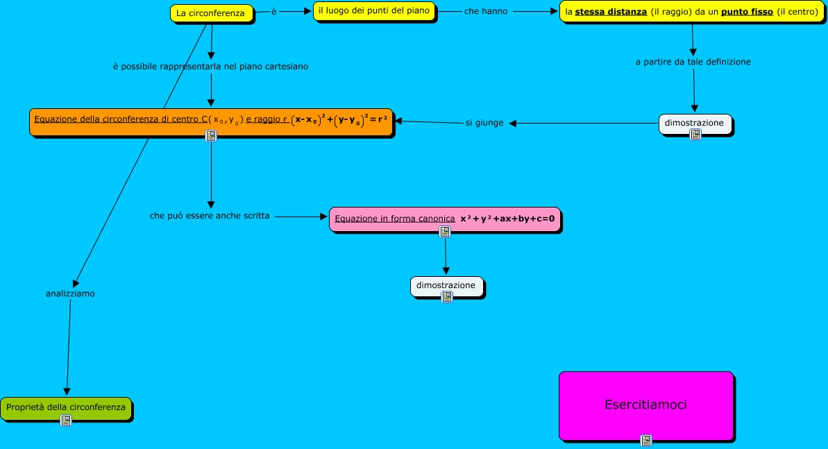 Questa Cmap, creata con IHMC CmapTools, contiene informazioni relative a: La circonferenza, <math xmlns="http://www.w3.org/1998/Math/MathML"> <mrow> <mtext> Equazione in forma canonica </mtext> <mmultiscripts> <mtext> x </mtext> <none/> <mtext> 2 </mtext> </mmultiscripts> <mtext> + </mtext> <mmultiscripts> <mtext> y </mtext> <none/> <mtext> 2 </mtext> </mmultiscripts> <mtext> +ax+by+c=0 </mtext> </mrow> </math> ???? dimostrazione, dimostrazione si giunge <math xmlns="http://www.w3.org/1998/Math/MathML"> <mrow> <mtext> Equazione della circonferenza di centro C( </mtext> <mmultiscripts> <mtext> x </mtext> <mtext> 0 </mtext> <none/> </mmultiscripts> <mtext> , </mtext> <mmultiscripts> <mtext> y </mtext> <mtext> 0 </mtext> <none/> </mmultiscripts> <mtext> ) e raggio r </mtext> <mmultiscripts> <mfenced open="(" close=")"> <mtext> x- </mtext> <mmultiscripts> <mtext> x </mtext> <mtext> 0 </mtext> <none/> </mmultiscripts> </mfenced> <none/> <mtext> 2 </mtext> </mmultiscripts> <mtext> + </mtext> <mmultiscripts> <mfenced open="(" close=")"> <mtext> y- </mtext> <mmultiscripts> <mtext> y </mtext> <mtext> 0 </mtext> <none/> </mmultiscripts> </mfenced> <none/> <mtext> 2 </mtext> </mmultiscripts> <mtext> = </mtext> <mmultiscripts> <mtext> r </mtext> <none/> <mtext> 2 </mtext> </mmultiscripts> </mrow> </math>, La circonferenza è possibile rappresentarla nel piano cartesiano <math xmlns="http://www.w3.org/1998/Math/MathML"> <mrow> <mtext> Equazione della circonferenza di centro C( </mtext> <mmultiscripts> <mtext> x </mtext> <mtext> 0 </mtext> <none/> </mmultiscripts> <mtext> , </mtext> <mmultiscripts> <mtext> y </mtext> <mtext> 0 </mtext> <none/> </mmultiscripts> <mtext> ) e raggio r </mtext> <mmultiscripts> <mfenced open="(" close=")"> <mtext> x- </mtext> <mmultiscripts> <mtext> x </mtext> <mtext> 0 </mtext> <none/> </mmultiscripts> </mfenced> <none/> <mtext> 2 </mtext> </mmultiscripts> <mtext> + </mtext> <mmultiscripts> <mfenced open="(" close=")"> <mtext> y- </mtext> <mmultiscripts> <mtext> y </mtext> <mtext> 0 </mtext> <none/> </mmultiscripts> </mfenced> <none/> <mtext> 2 </mtext> </mmultiscripts> <mtext> = </mtext> <mmultiscripts> <mtext> r </mtext> <none/> <mtext> 2 </mtext> </mmultiscripts> </mrow> </math>, il luogo dei punti del piano che hanno la stessa distanza (il raggio) da un punto fisso (il centro), La circonferenza analizziamo Proprietà della circonferenza, <math xmlns="http://www.w3.org/1998/Math/MathML"> <mrow> <mtext> Equazione della circonferenza di centro C( </mtext> <mmultiscripts> <mtext> x </mtext> <mtext> 0 </mtext> <none/> </mmultiscripts> <mtext> , </mtext> <mmultiscripts> <mtext> y </mtext> <mtext> 0 </mtext> <none/> </mmultiscripts> <mtext> ) e raggio r </mtext> <mmultiscripts> <mfenced open="(" close=")"> <mtext> x- </mtext> <mmultiscripts> <mtext> x </mtext> <mtext> 0 </mtext> <none/> </mmultiscripts> </mfenced> <none/> <mtext> 2 </mtext> </mmultiscripts> <mtext> + </mtext> <mmultiscripts> <mfenced open="(" close=")"> <mtext> y- </mtext> <mmultiscripts> <mtext> y </mtext> <mtext> 0 </mtext> <none/> </mmultiscripts> </mfenced> <none/> <mtext> 2 </mtext> </mmultiscripts> <mtext> = </mtext> <mmultiscripts> <mtext> r </mtext> <none/> <mtext> 2 </mtext> </mmultiscripts> </mrow> </math> che può essere anche scritta <math xmlns="http://www.w3.org/1998/Math/MathML"> <mrow> <mtext> Equazione in forma canonica </mtext> <mmultiscripts> <mtext> x </mtext> <none/> <mtext> 2 </mtext> </mmultiscripts> <mtext> + </mtext> <mmultiscripts> <mtext> y </mtext> <none/> <mtext> 2 </mtext> </mmultiscripts> <mtext> +ax+by+c=0 </mtext> </mrow> </math>, La circonferenza è il luogo dei punti del piano, la stessa distanza (il raggio) da un punto fisso (il centro) a partire da tale definizione dimostrazione
